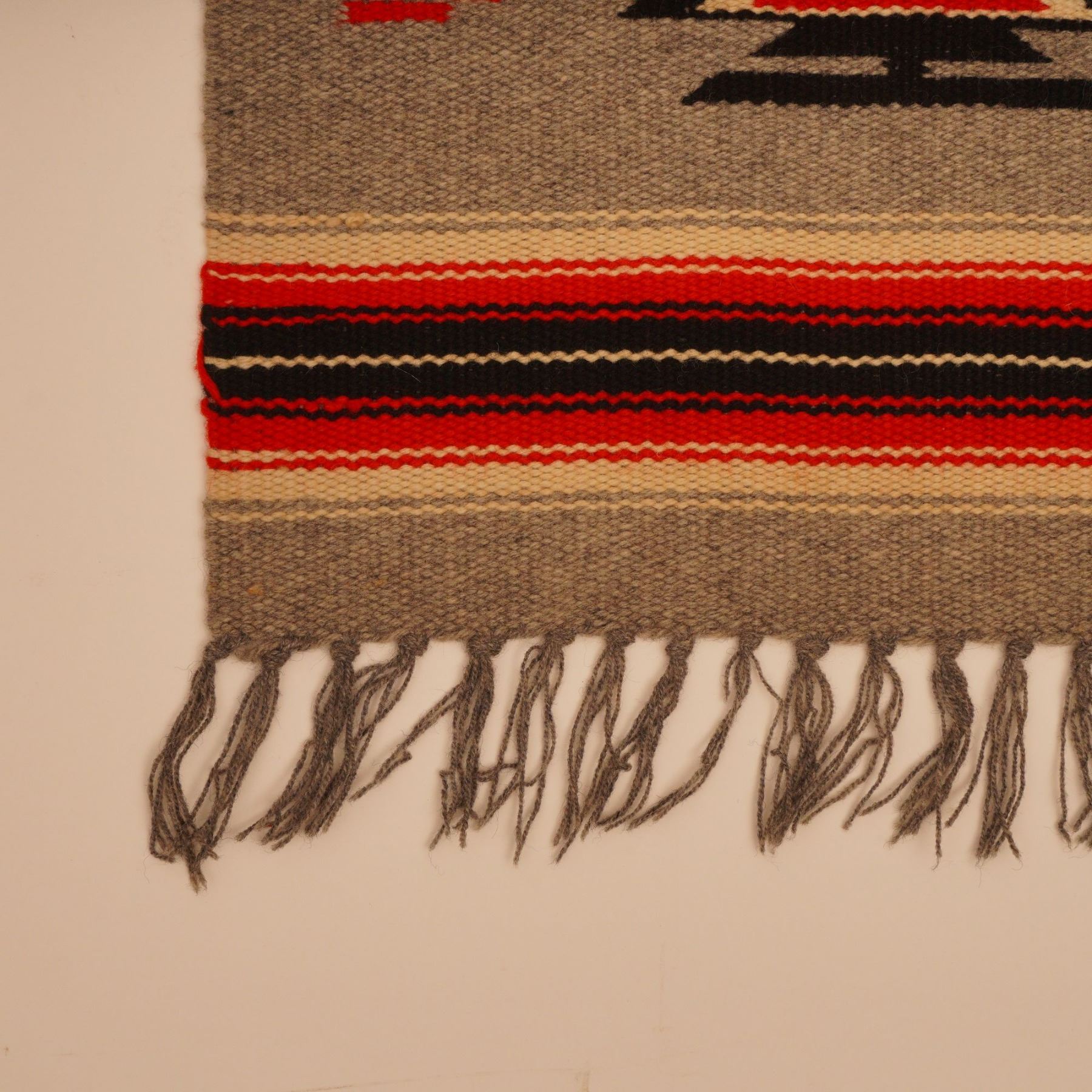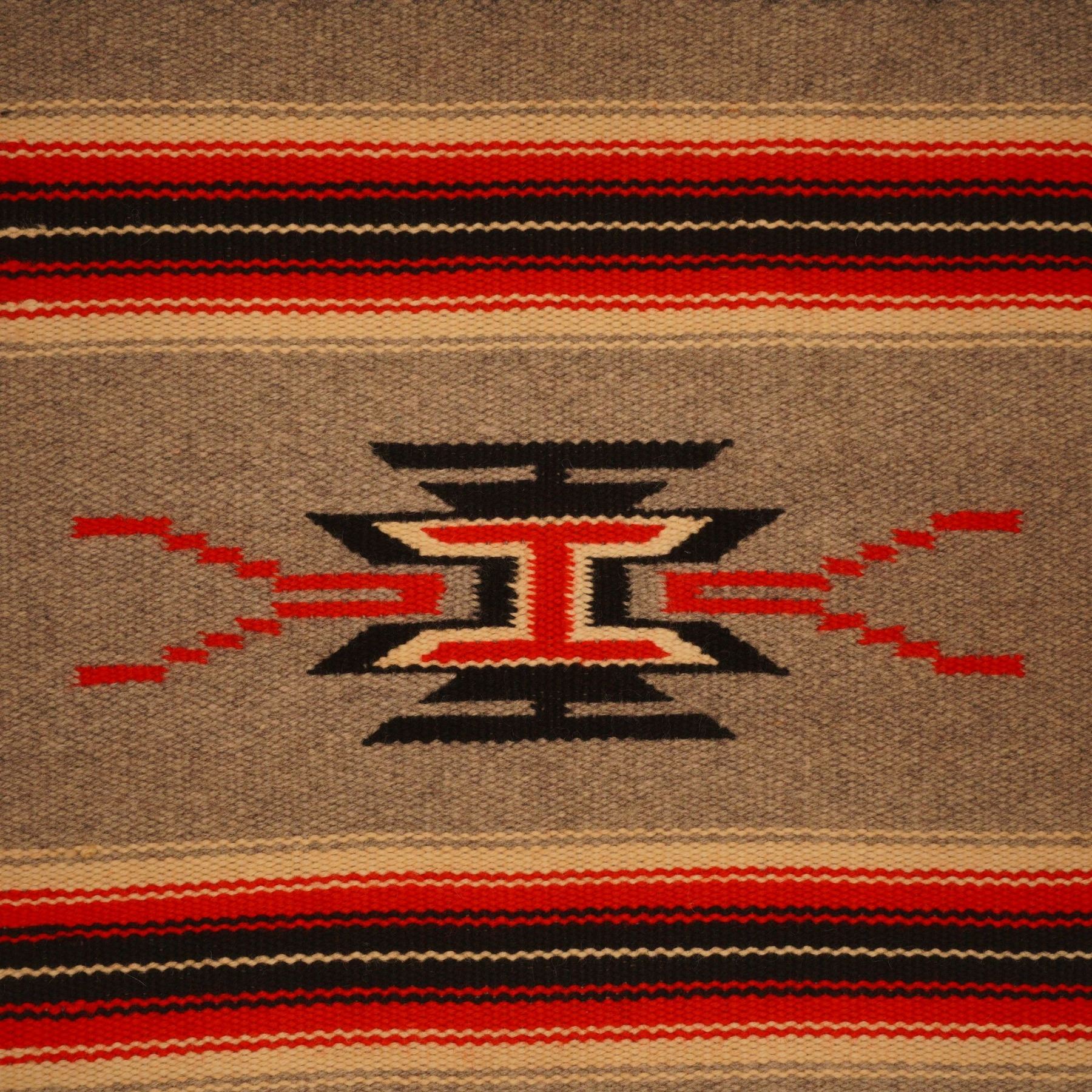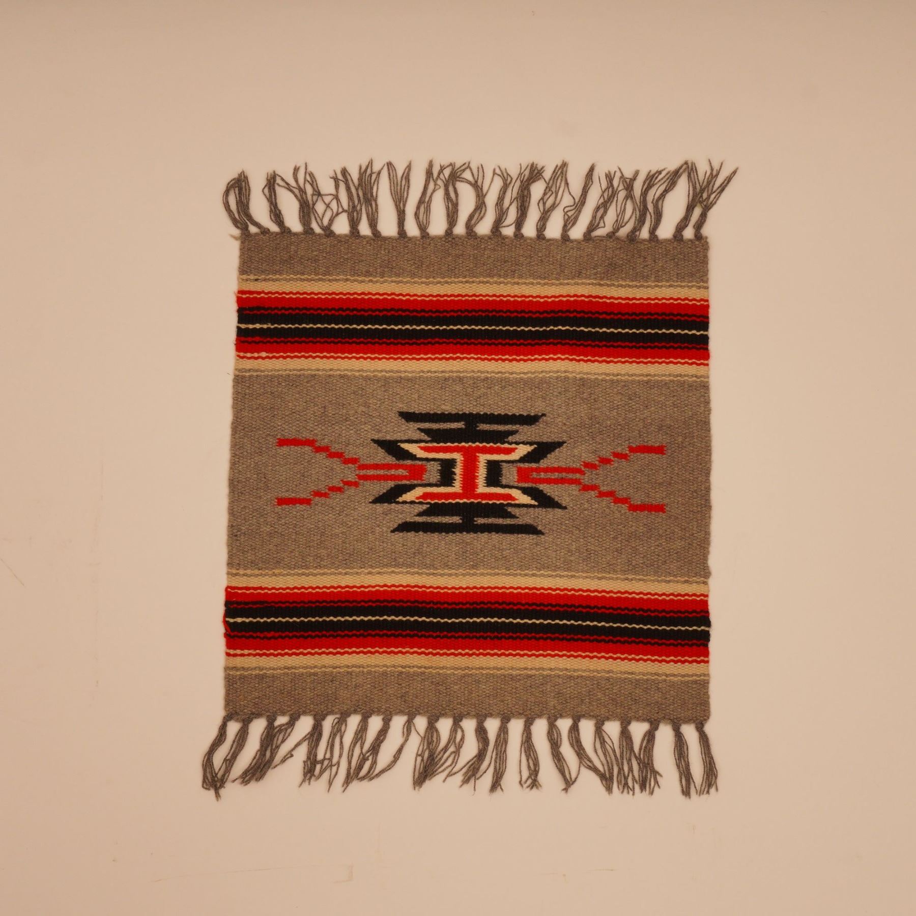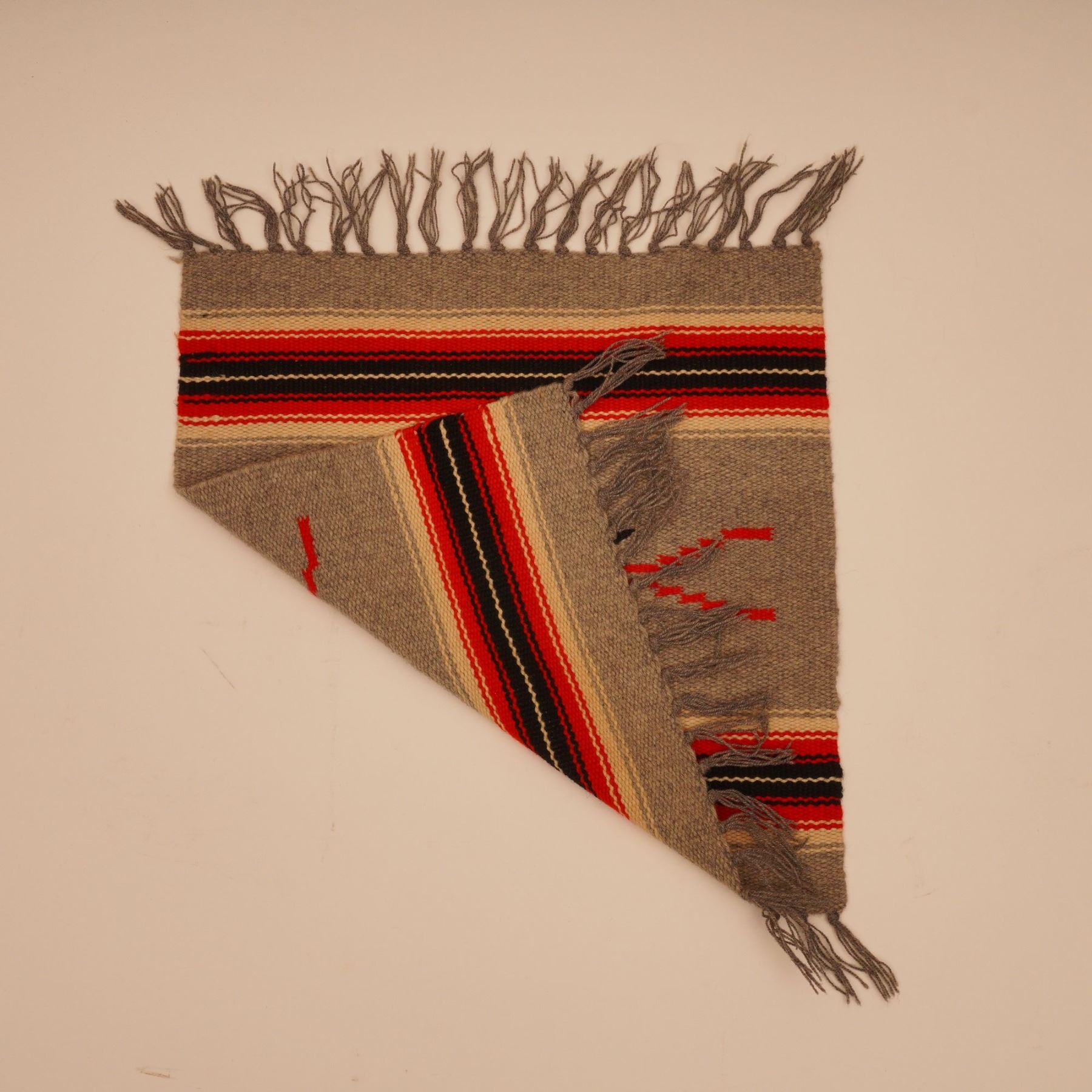 Small handwoven wool textile in the Chimayo tradition, featuring a central stepped diamond motif with arrow-like extensions in red, black, and cream on a gray ground. Framed by bold horizontal stripes and fringed edges, this piece exemplifies the craftsmanship of New Mexico weaving. Compact in size, it is ideal as a wall hanging, table accent, or decorative chair or shelf covering, bringing a touch of Southwestern artistry to any space. A finely woven and vibrant example of traditional textile design.