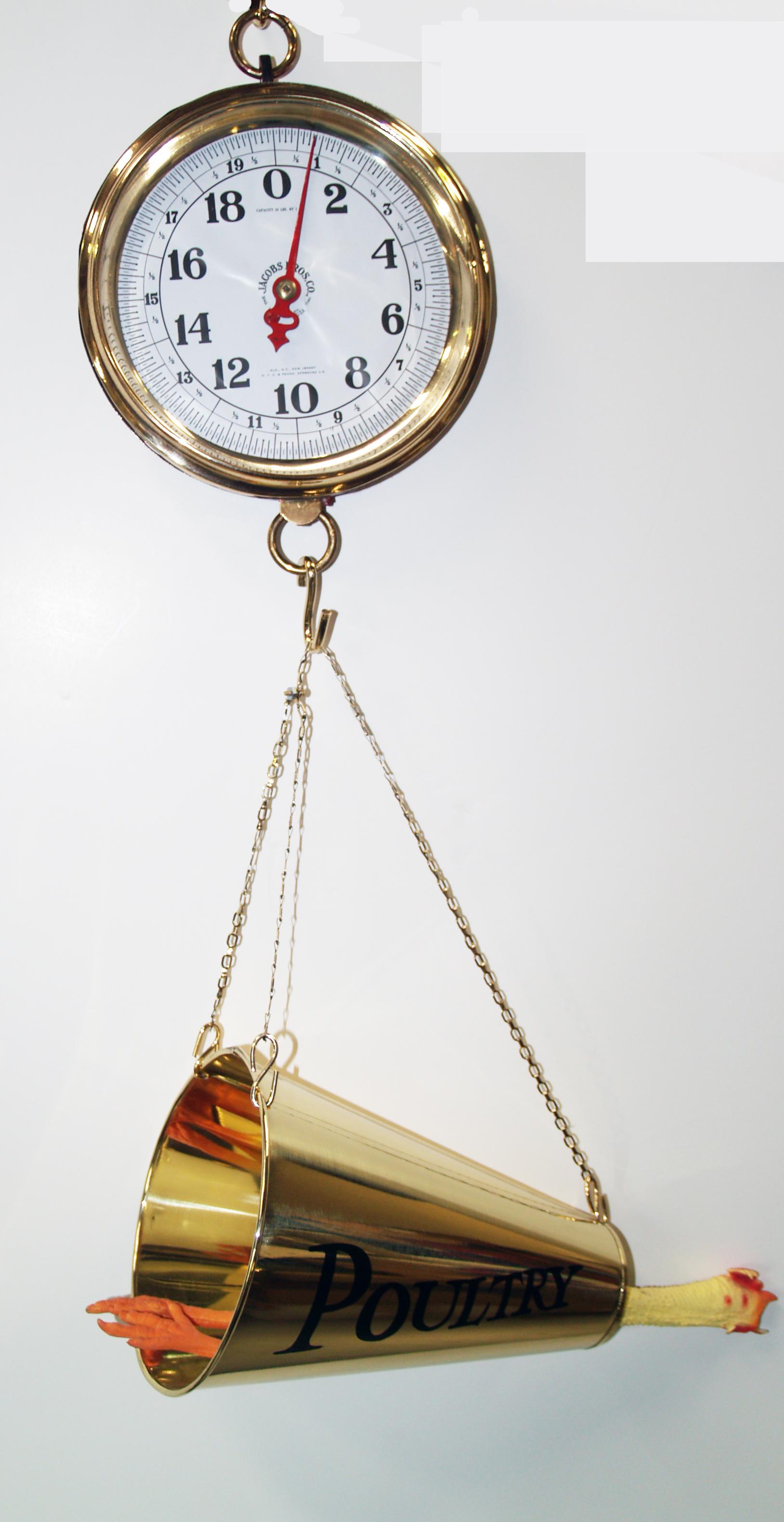 Small Hanging Produce Scale Maroon & Brass (Funnel shaped scoop is for weighing small live poultry)