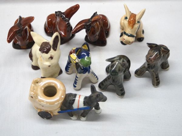 Small Herd of Donkey Figurines, 9 in all, 3 from Mexican (Tonala), largest measures 4.75'' x 3'' x 1.5'', one of the donkey's ears is chipped and glued