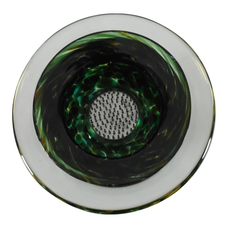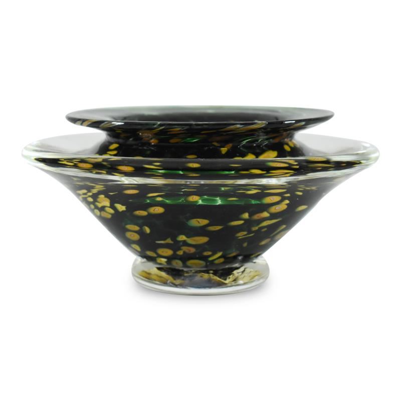 This hand-blown "Small Ikebana Flower Bowl" features a secured "Kenzan" spiked disc inside - the key to any fine Ikebana style flower arrangement. This one-of-a-kind flower bowl is hand signed by GartnerBlade Glass. Measures approx. 6" (diameter) x 3" (height).