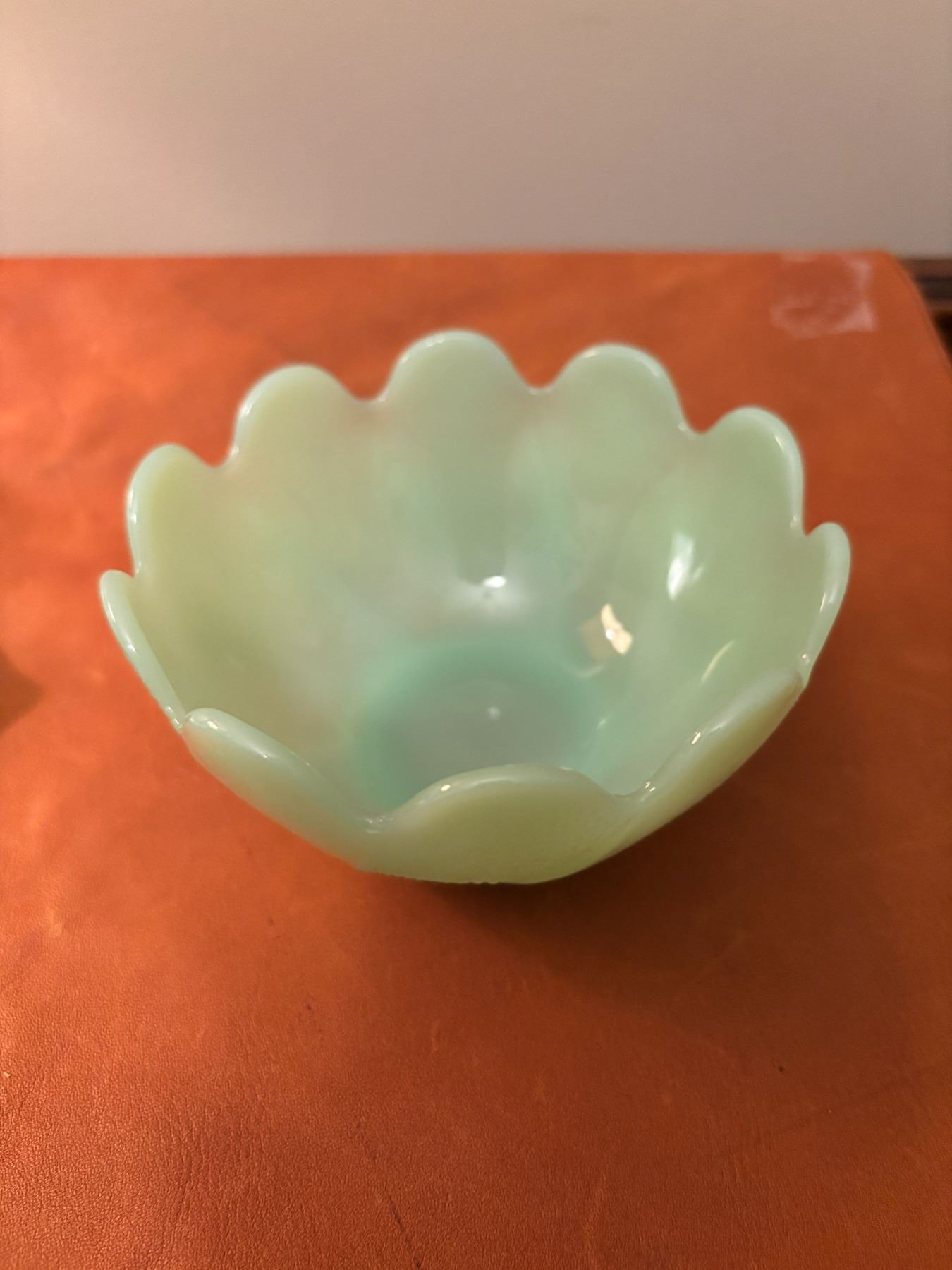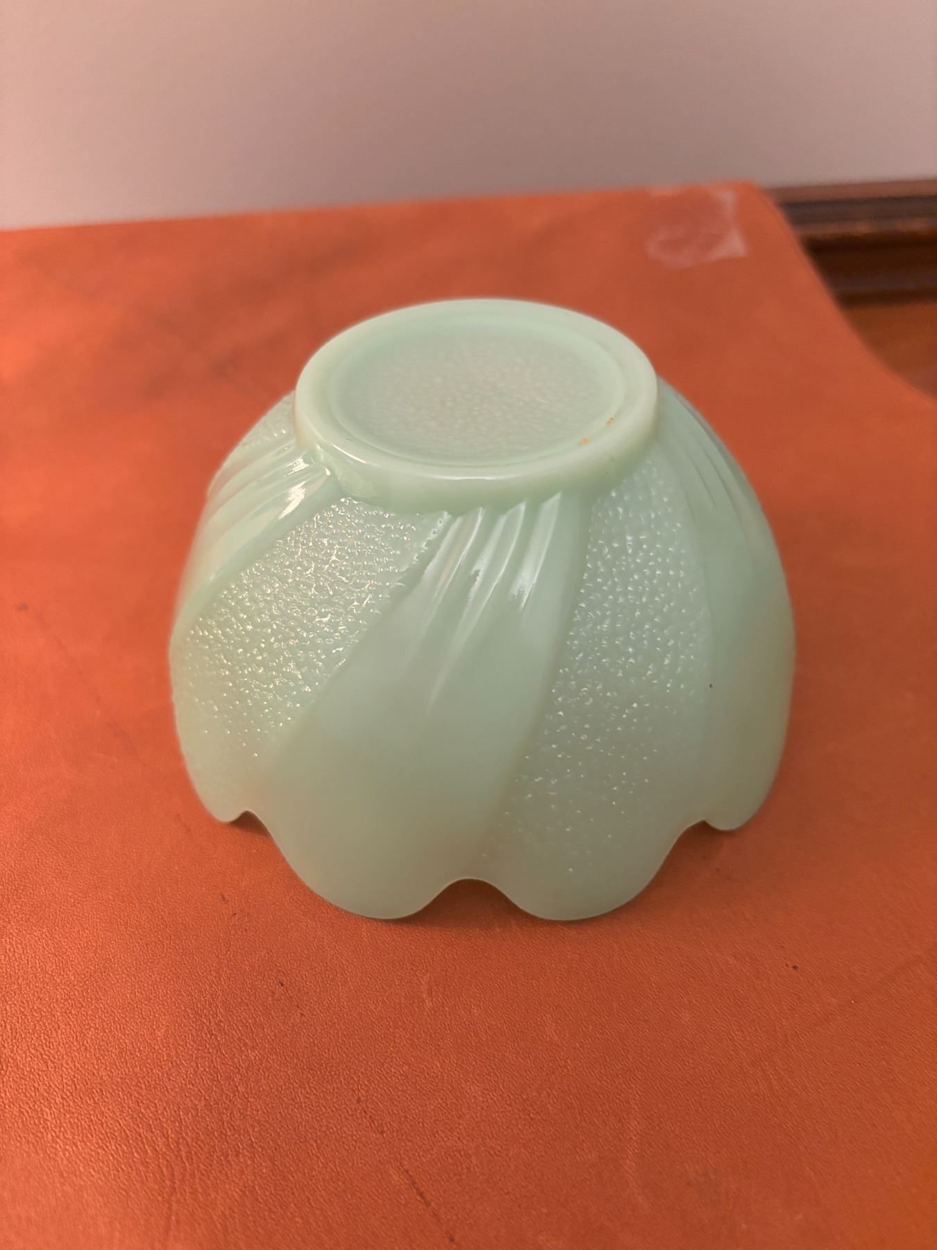 Measures 4.5” across, 2.5” high, has scalloped edges and smooth inside. Outside of bowl has a swirl type pattern of ribs and texture.