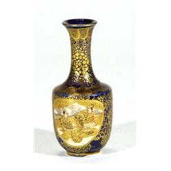 Small Japanese Satsuma pottery vase, hand painted and gilded with warriors and figures onto a blue and gilt ground, 10cm high
