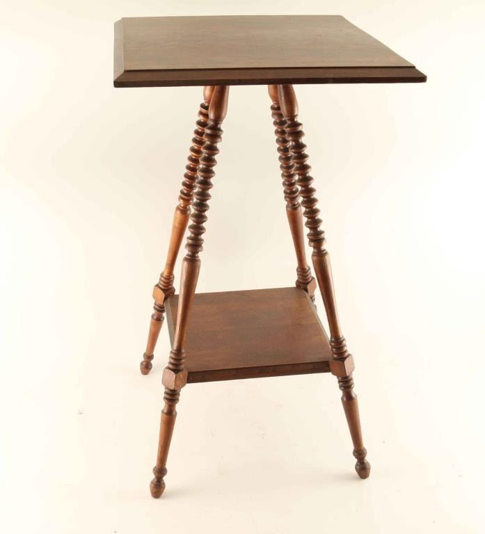 Square tabletop with small lower shelf. Spindle top legs going down to nicely turned columns. Some minor scratches and crack on bottom shelf.