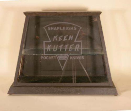Small Keen Kutter showcase, great size, slant front, pyramid shape, 19" x 14" x 7". Etching is on the front of glass so not sure of origin.