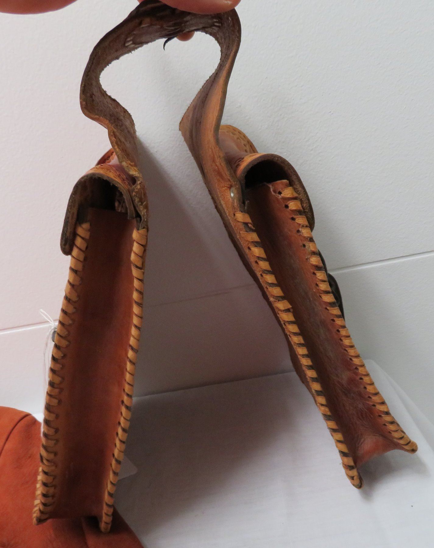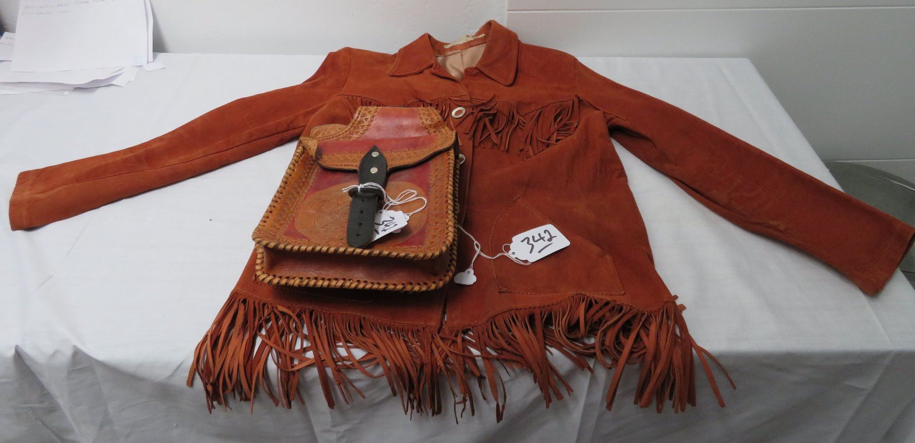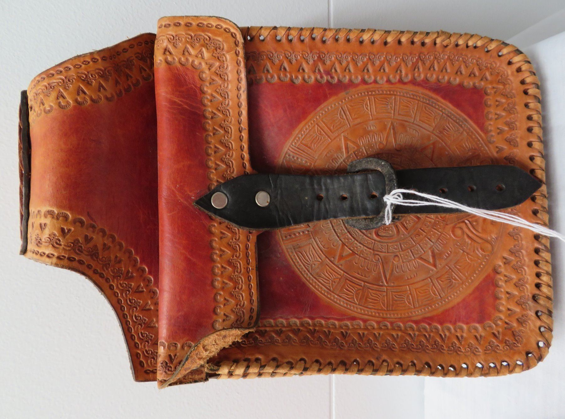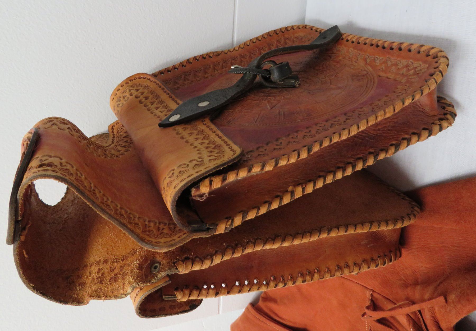 Small Leather Jacket + Tooled Mexican Saddlebags, c. 1950s. Made of leather, the jacket measures 18" x 24 and the saddlebags measure 10" x 9". Mexico, USA, Danz Western Wear (?). Condition: Good, see images. Shipping: $22.50 w/insurance and signature.
