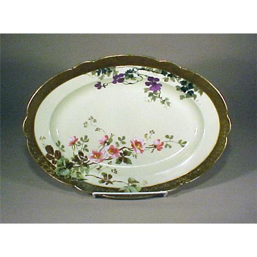 Here is a sensational Limoges platter that is masterful in design. The colors are vivid and naturalistic. The detail is exceptional! It has purple and pink enameled flowers embracing the edges in a fabulous free flowing form. The outer rim is gold gilded with an interior rim that is in a pale pea green with specks of gold enameling throughout. The platter is in very good condition with - to be expected - minute wear to the gold gilding on the outer rim. It measures 15 3/8? long x 10 ½?w x 1 ¾?h. There is an impressed mark on the bottom of an intertwined RM in fancy script ? you can find this same mark in the book Distinctive Limoges Porcelain by Keith & Thomas Waterbrook-Clyde on page 237 for Martial Redon (1882-1896.) There is also an impressed mark of the number 14 and the letter L along with a red RB in fancy script.