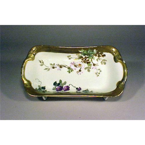 Here is a sensational small Limoges tray that is masterful in design. The colors are vivid and naturalistic. The detail is exceptional! It has purple and white enameled flowers embracing the edges in a fabulous free flowing form. The outer rim is gold gilded with an interior rim that is in a pale pea green with specks of gold enameling throughout. The tray is in very good condition ? though there is some wear to the gold gilding on the outer rim along with a good amount of wear to the handles on either end ? due to use and of course age. It measures 9 1/8?l x 4 5/8?w x 1 ½?h. There is an impressed mark on the bottom of an intertwined RM in fancy script ? you can find this same mark in the book Distinctive Limoges Porcelain by Keith & Thomas Waterbrook-Clyde on page 237 for Martial Redon (1882-1896.) In fancy script it is also marked in red RB.