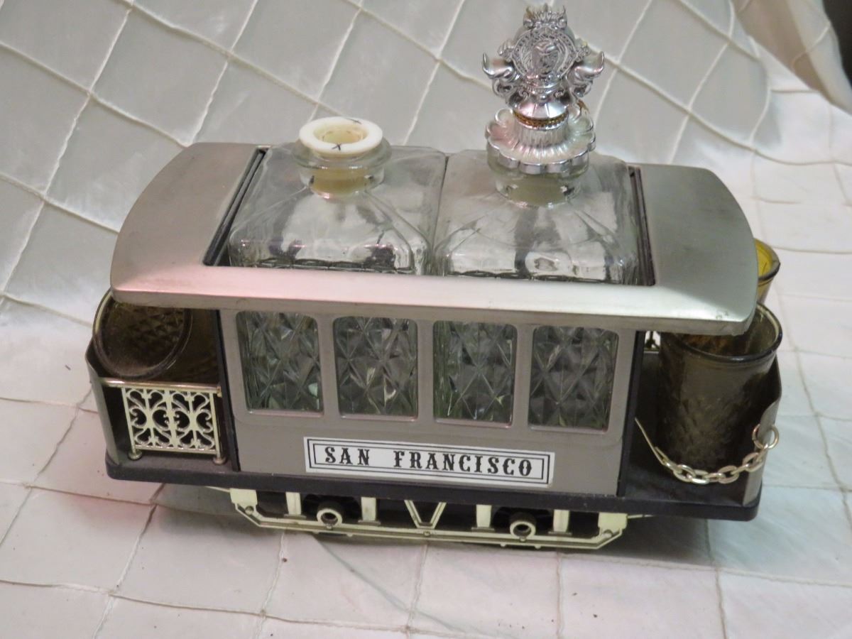 San Francisco Street Car (missing one stopper) with shot glasses and Park Sherman Pump Style Liqueur Dispenser