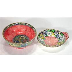 Small Maling bowl and a single handled dish, hand coloured and transfer printed with bands of flowers onto pink grounds, largest 14cm diameter