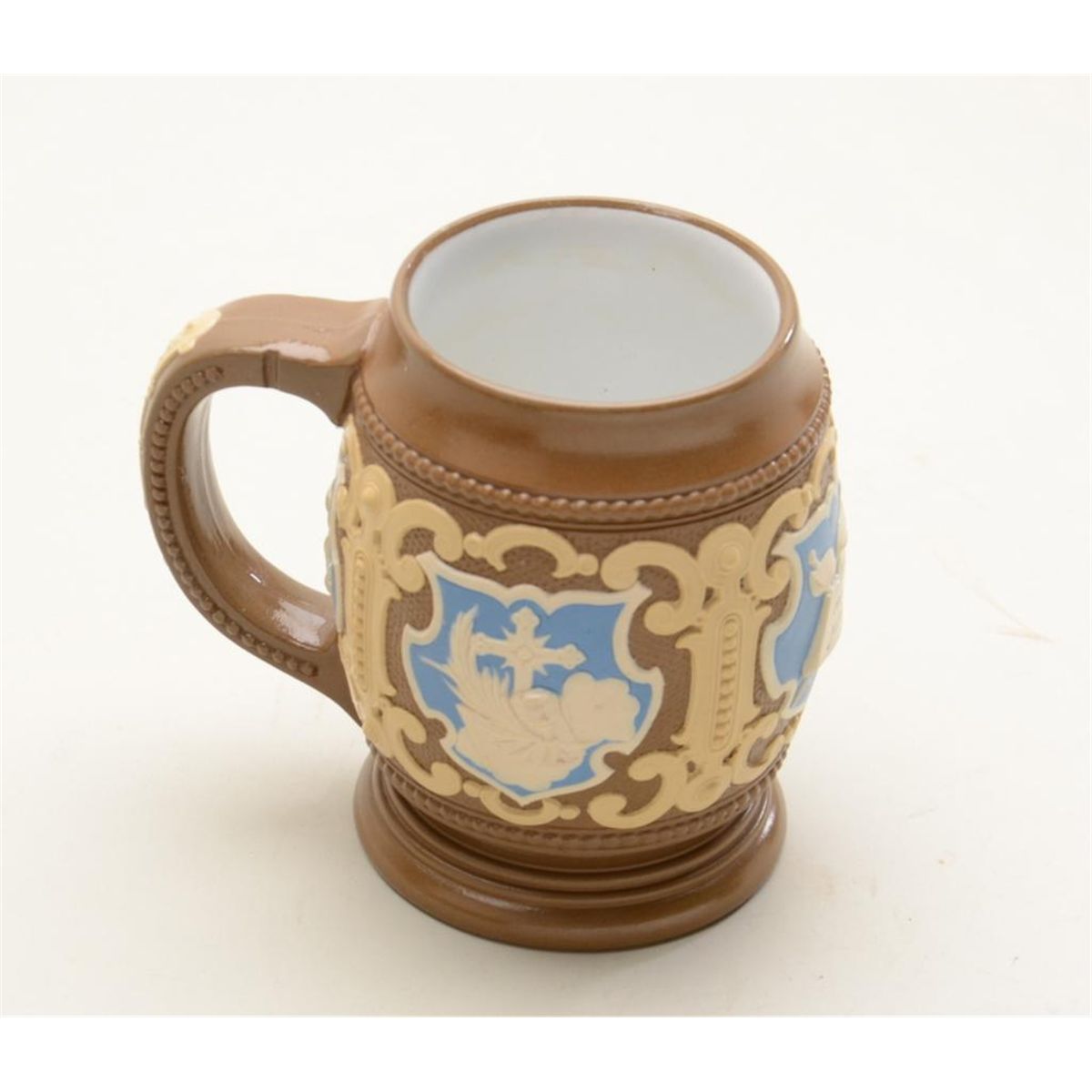 Small Metlach stein approx. 4-1/2” in height and approx. 3” in diameter, in fine condition with beautiful multi-color glazing; 3/10 of a liter. Est.: $100-$200.