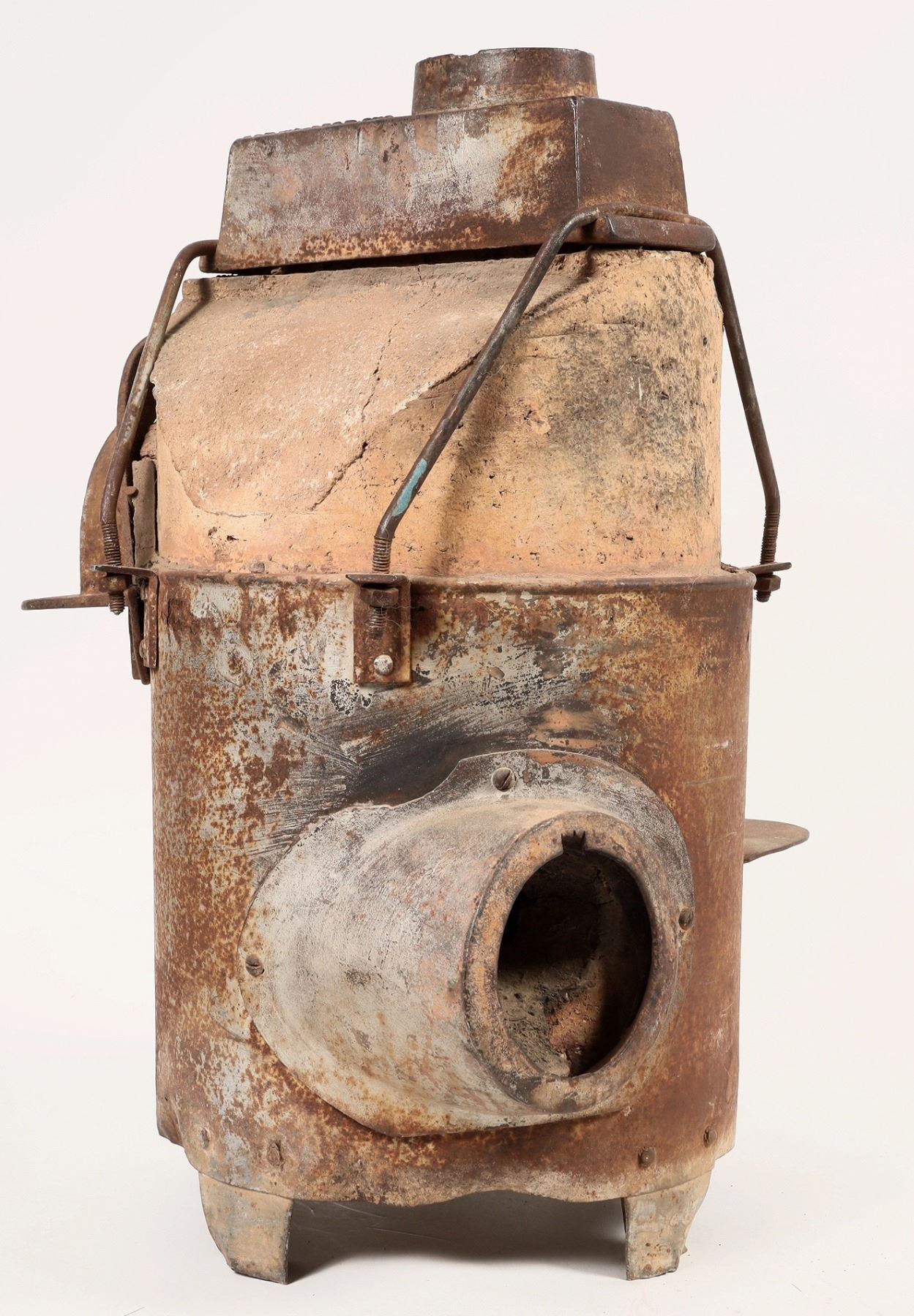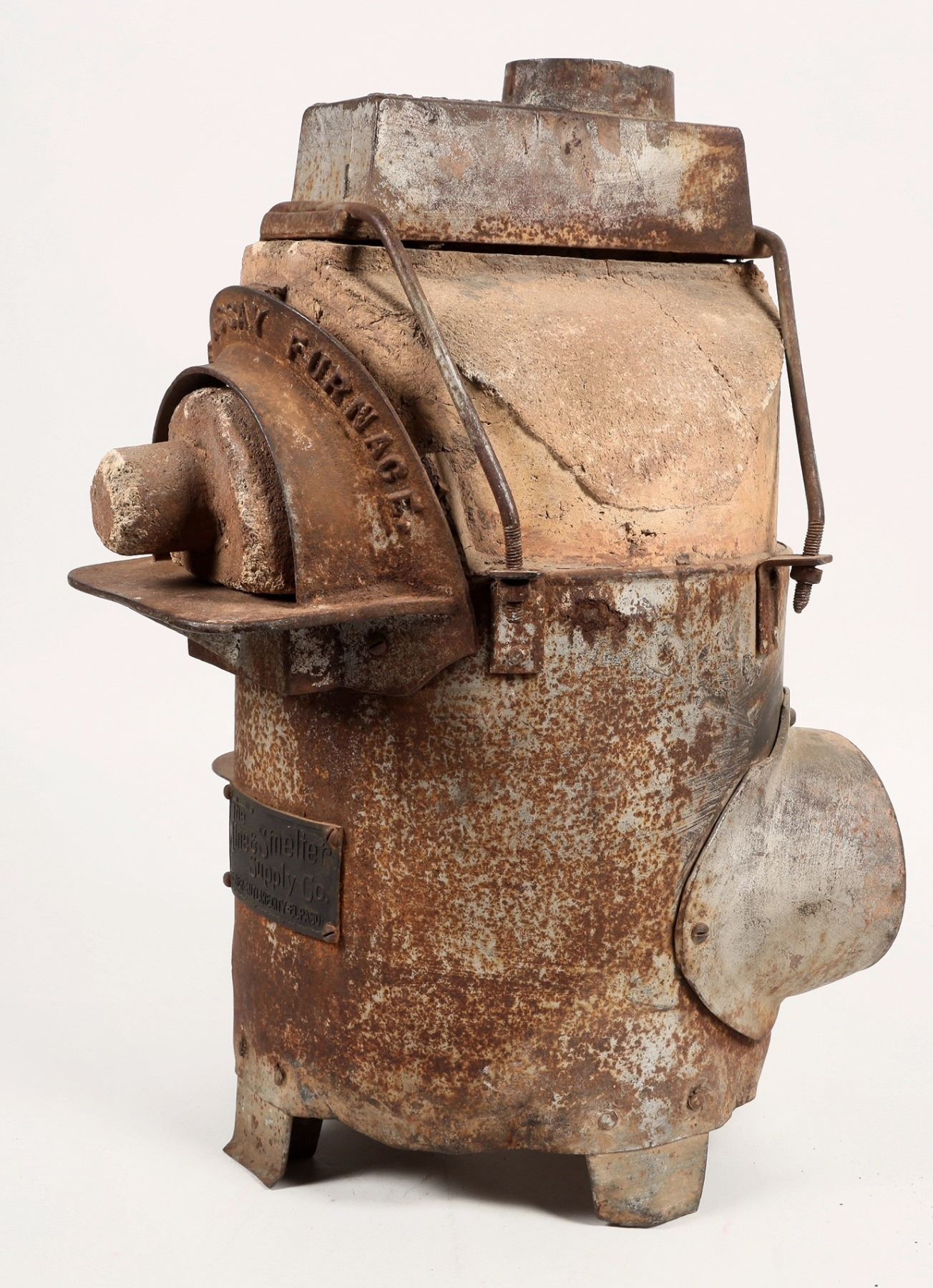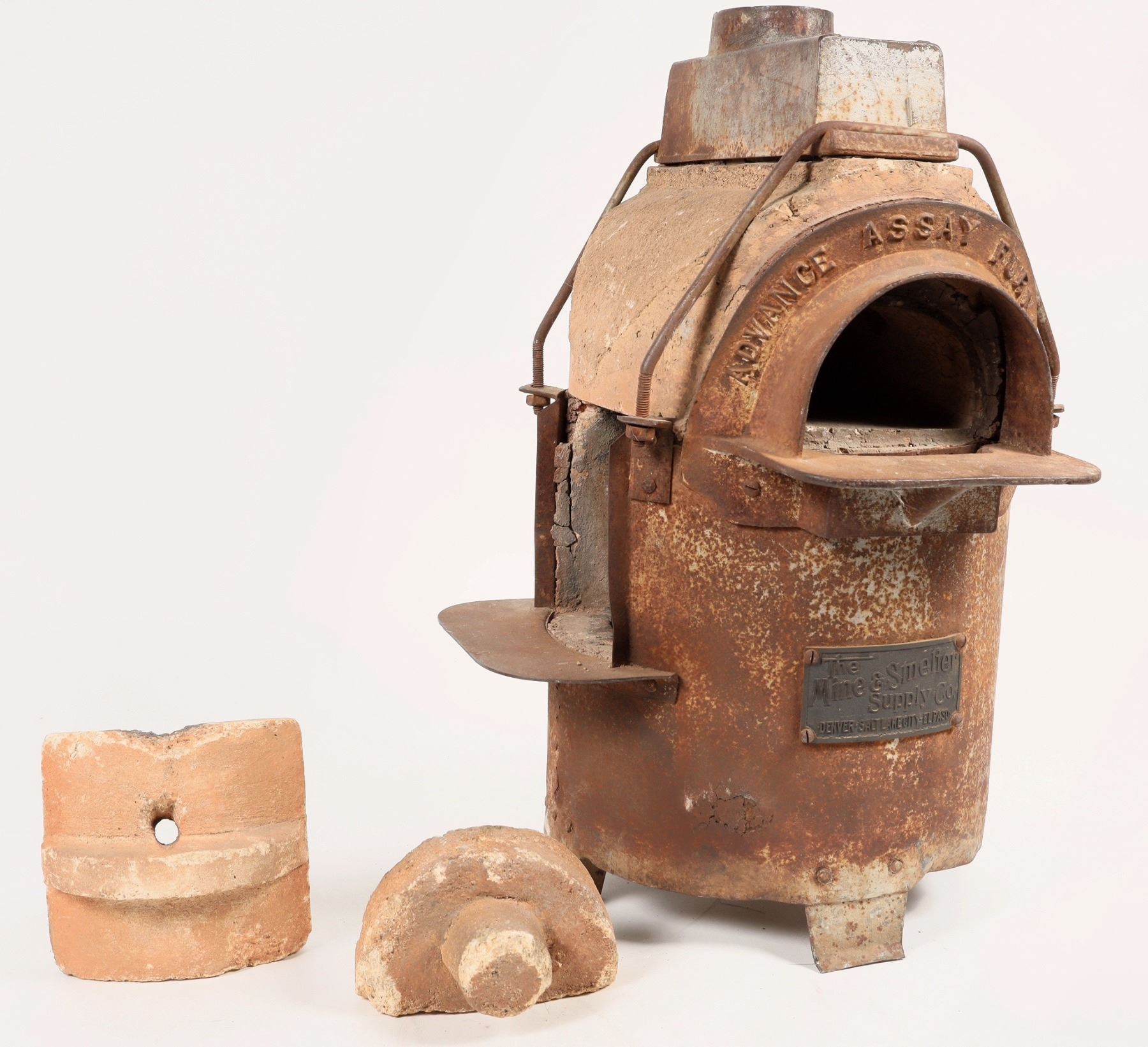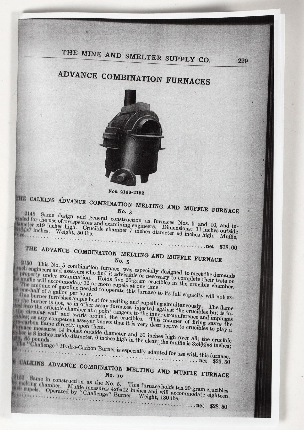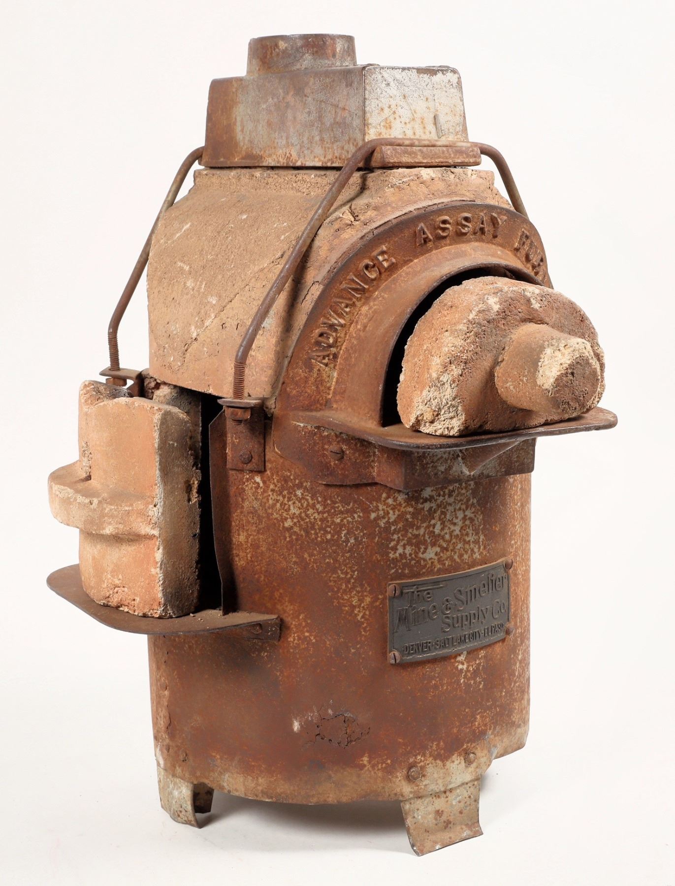 Small Calkins Advanced Combination Mining & Melting assay furnace No. 3 by Mine & Smelter Supply Co., Denver, Salt Lake, El Paso. The top was made Calkins Co., Los Angeles. Comes with the front closure and protective device as well as several cupels. Dual furnace entry. Top section for cupels accessible from the front. Bottom section for crucibles. Would hold a single 5 assay ton crucible. Both bone ash closures present, usually missing. Would have been used during Tonopah Goldfield Rush in Nevada. 20" H x 13" W x 13.5" D. Very attractive small assay furnace. Found in Mine Smelter Supply Catalog, 1912. Considered Calkins Advanced Combination Mining & Melting Furnace 3. Same design as furnaces 5 and 10, intended for the use of prospector and examining engineers (pg. 229).