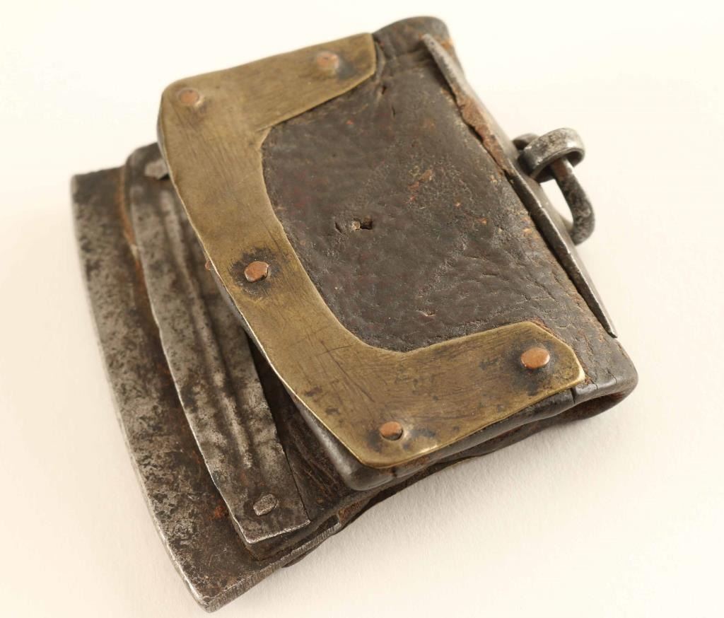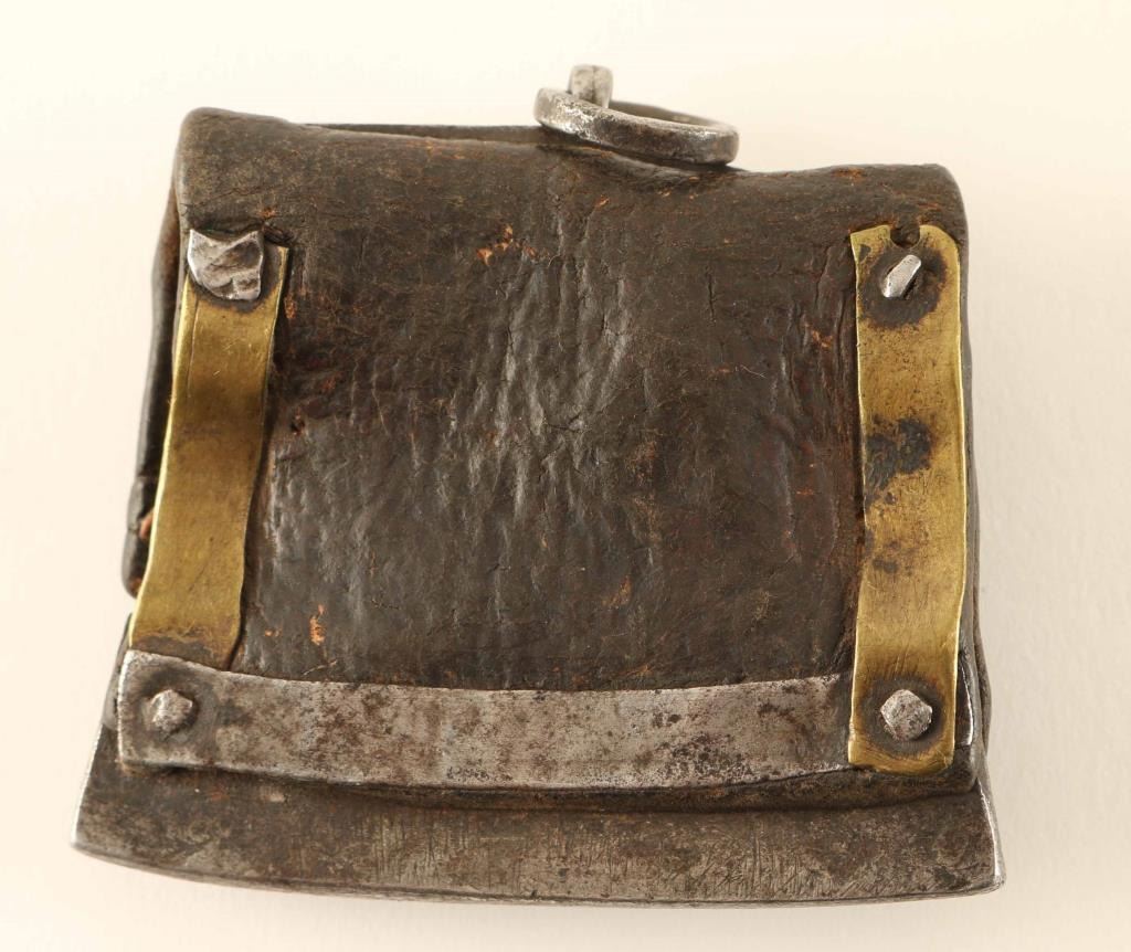 Saddle leather with German silver and brass. Measures 2 1/4" x 2 5/8". Shows age