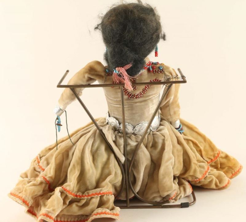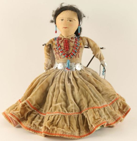 Handmade with cream colored velvet dress, beaded earrings, shirt and moccasins and small metal concho belt. Wool hair and hand painted face. Measures 14" tall.