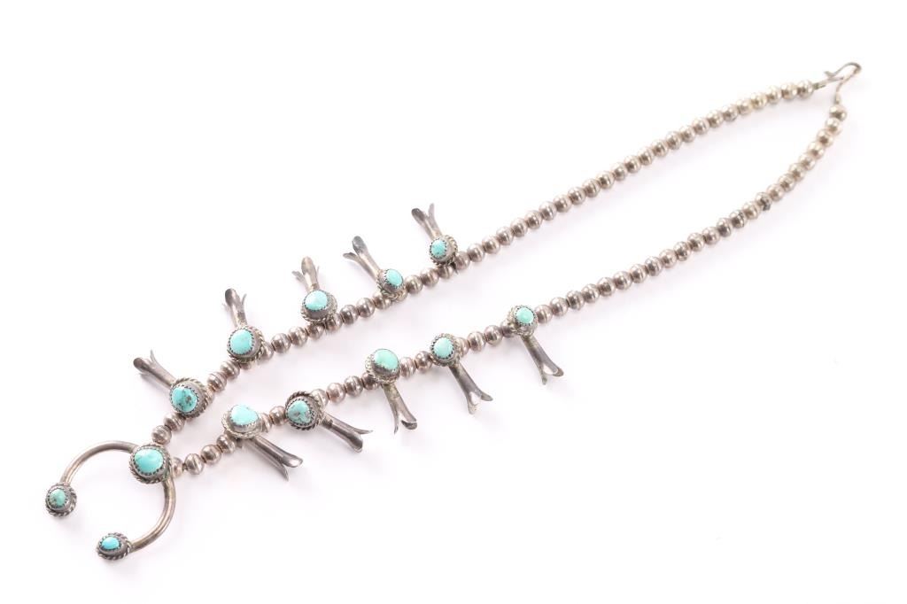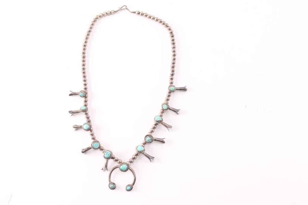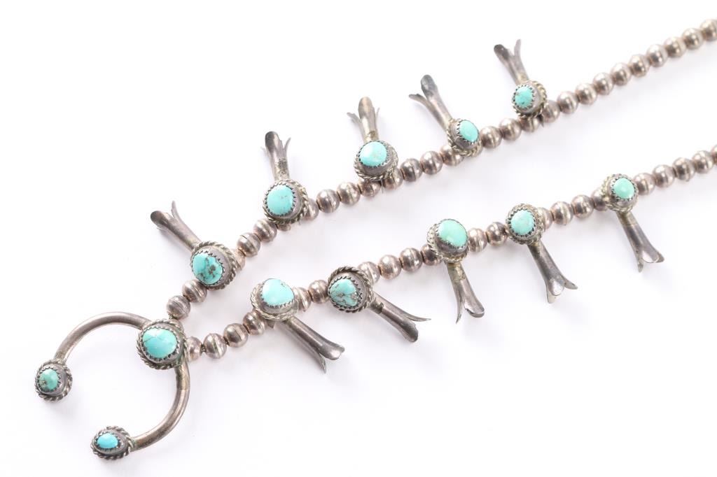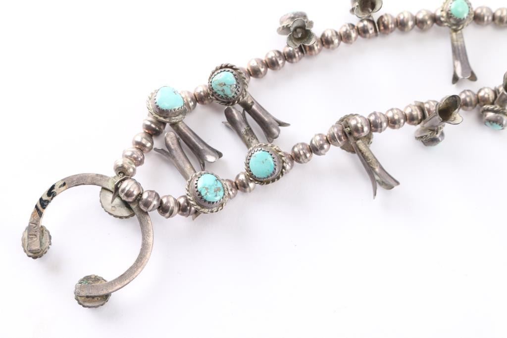 With ten squash blossoms, each with a pretty sky blue turquoise stone, and the naja has matching turquoise stone plus two smaller matching stones on each end. Measures 12" from drop.