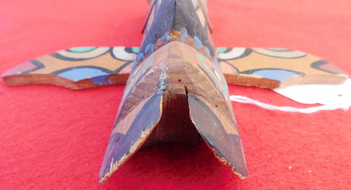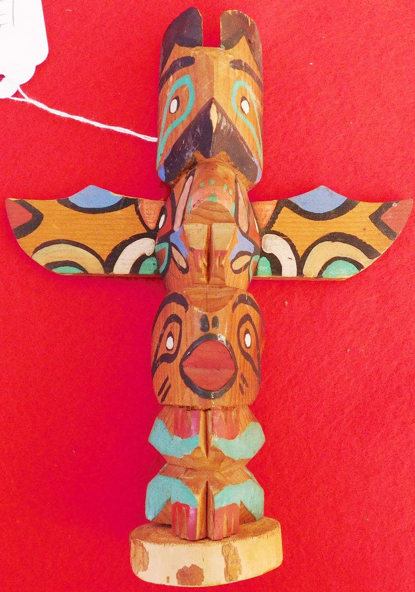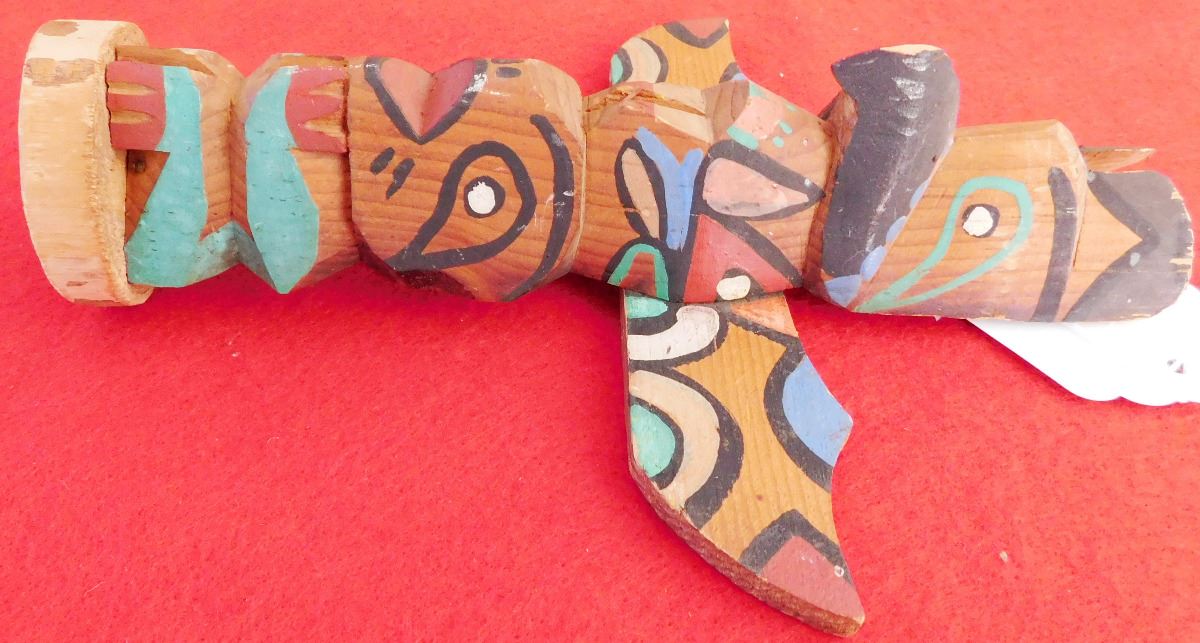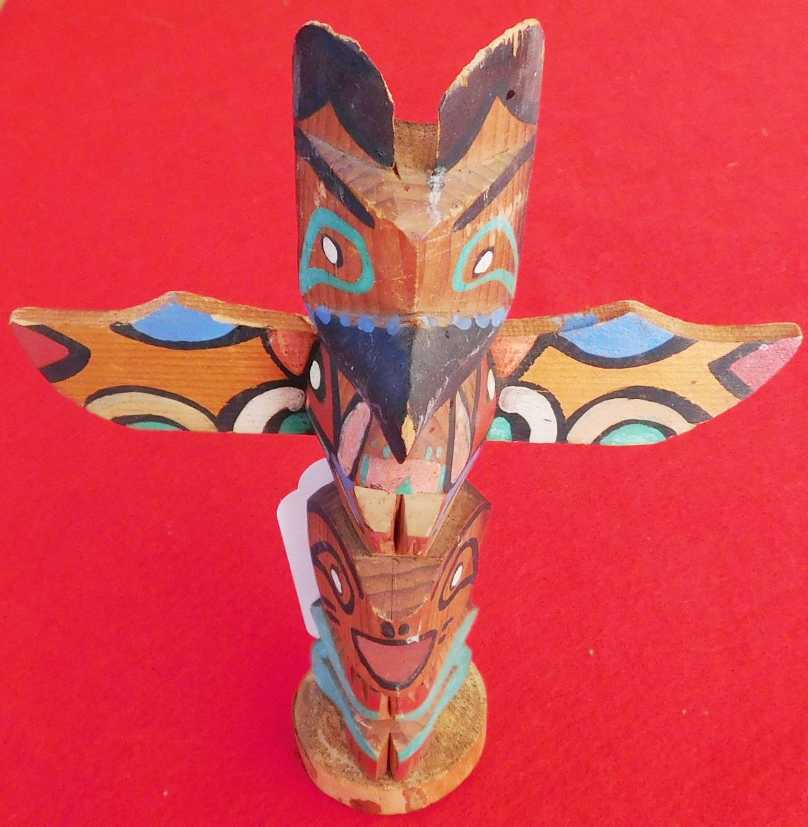 Northwest Coast Small totem pole, measuring 8 1/2 x 7 x 3 inches. This item is made from cedar and paint. The item is signed. Condition: Worn with some minor paint loss. Shipping: $16.50