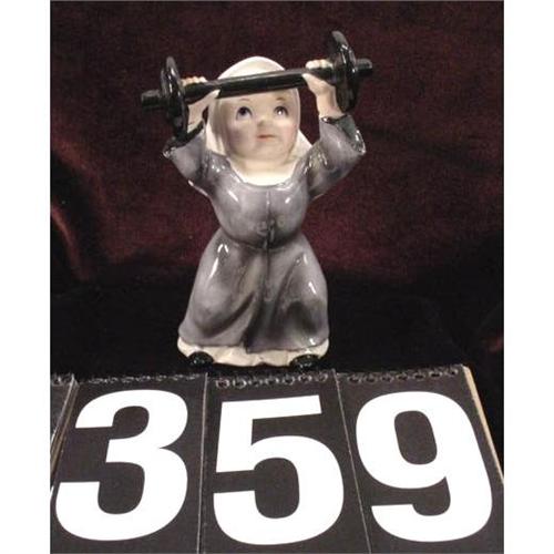This little nun lifting weights is made in Japan 5" high and in nice condition part of a collection.{54]