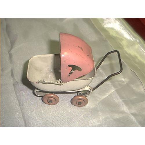 This one is one I have never seen before. It is all made of metal and is pink and white. It is a very old, I guess, possibly hand made, not sure, very old carriage. It is 4" H X 5" L X 2 1/2" W. Very unique and cute, and colorful. Never seen one like it in 47 years of doing antiques. She came from a great elderly lady's estate, as she collected for 84 years. We have other items, cribs, many dolls, named and dated, and will be putting them up here. High bidder will take the item, as we have no idea what they are worth. Have to many people wanting to buy them, so we decided to give everyone a chance to own some of them. We hope you enjoy them, and they are a great add to any collection you may have. Whatever high bid is, we will be contacting you and letting you know you won it. Unless you buy it now, then you know you own it. Enjoy and all of the dolls will be up here for your bids. Hope you get some good ones. I was told she paid $250. for this one years ago. I find that hard to believe, but what do I know about dolls.
