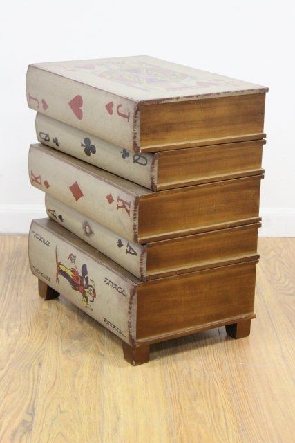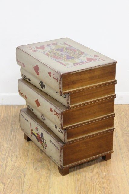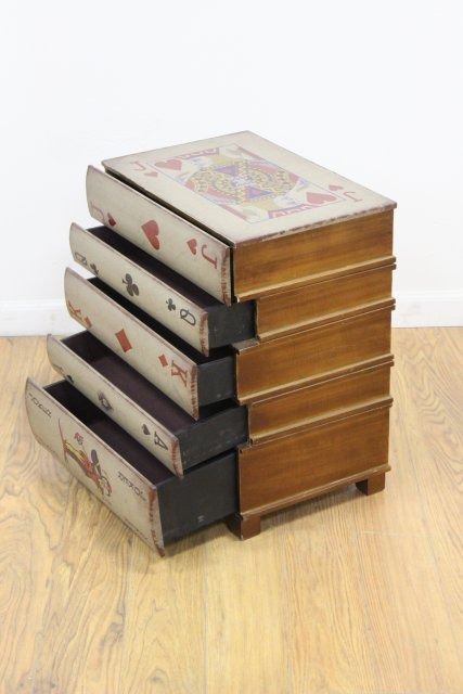 Faux leather. Decorated with playing cards. Approx. 21 3/4" H x 18 1/4" W x 12 1/2" D.