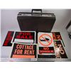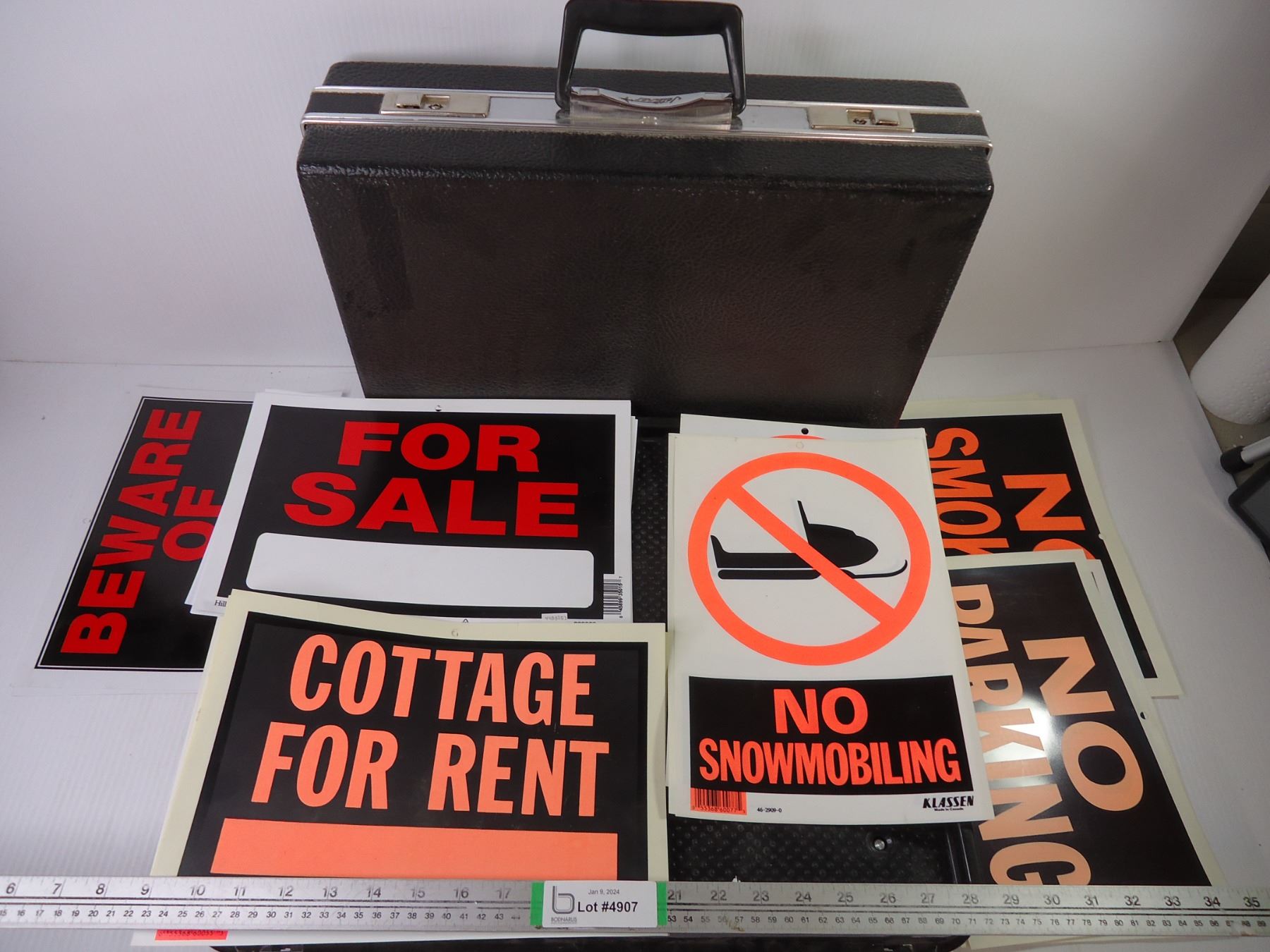Small Plastic 4 Wheel Dolly, Briefcase and Assorted Signs, "No Parking", "For Sale", "Beware of Dog" and others