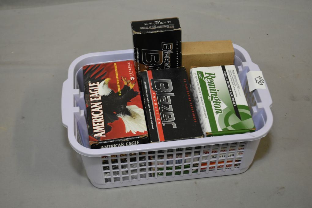 Small Plastic Tray : Approx Seven Boxes .9 MM Luger Cal Ammo [ some factory , some reloads, various makers ] 4 Boxes ( 50 ) .45 Auto some factory some reloads