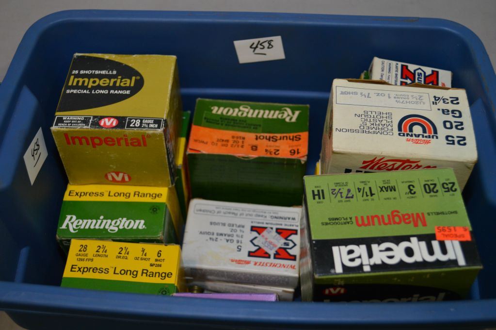 Small Plastic Tub : Approx 4 Boxes .20 Ga Shot Shells - 4 Boxes .28 Ga Shot Shells - 1 & Part Box .410 Ga Shot Shells plus slugs - Part box .16 Ga plus Two Boxes .16 Ga Slugs