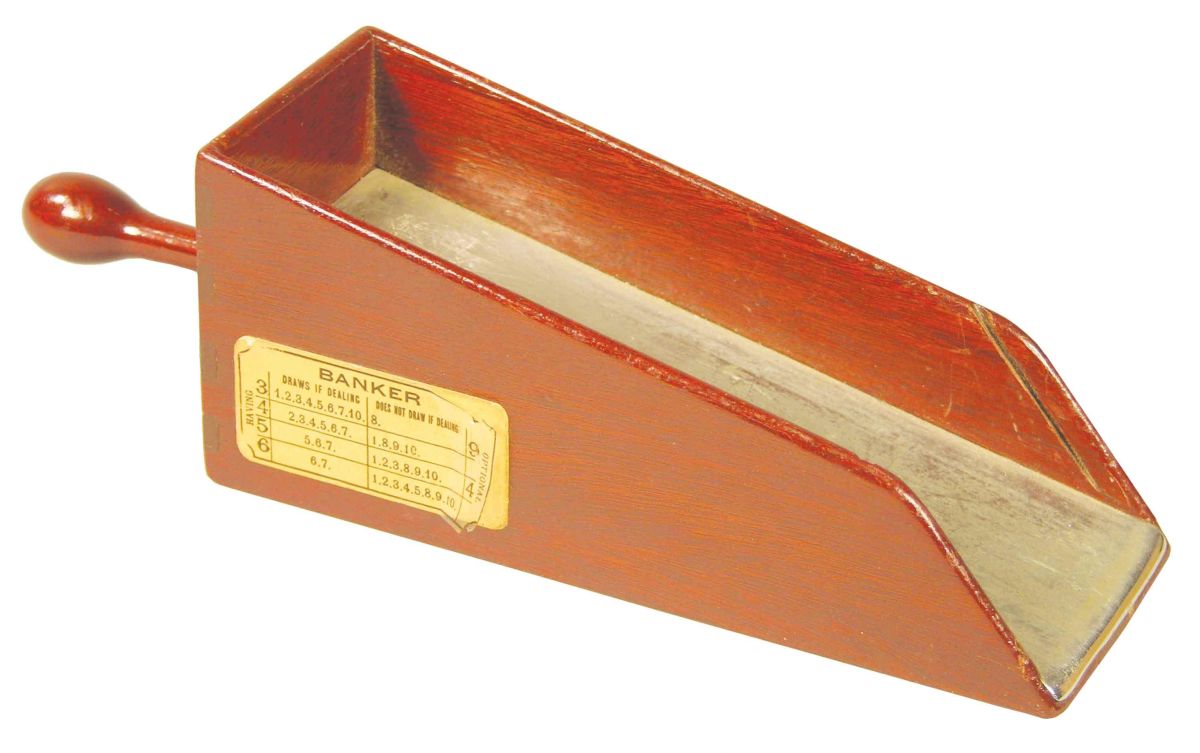 Small Playing Card Shoe, 1920. Made of wood and metal, banker numbers on the side. Excellent condition. 8 X 2 1/2 X 2 7/8 inches.