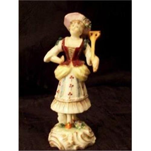 We offer this porcelain figurine of a woman holding a rake over her shoulder. She is hand painted with gilt work, and is wearing a maiden like dress. She holds a rake over her left shoulder. There is a Sevres mark on the base in blue under the glaze. She measures 3 7/8" tall, and 1 3/4" wide. There is some damage to the rake, A piece is missing, as well as some tines are gone. Other than that, she is in very good condition.
