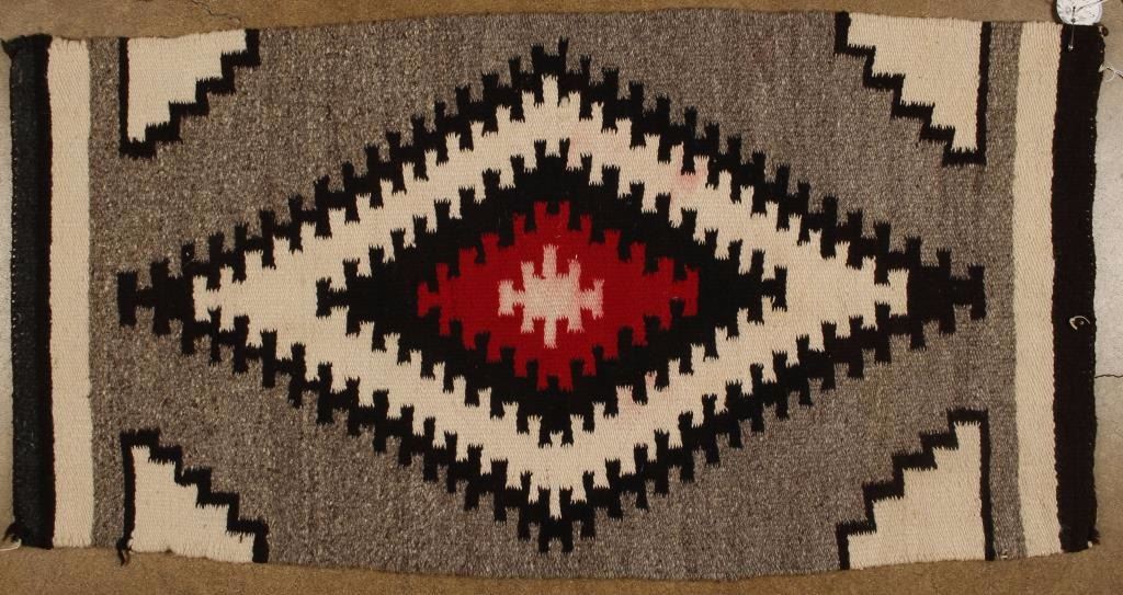 Navajo eye dazzler pattern in red, black and white, 34"x18". Condition fair, shows staining and bleeding.