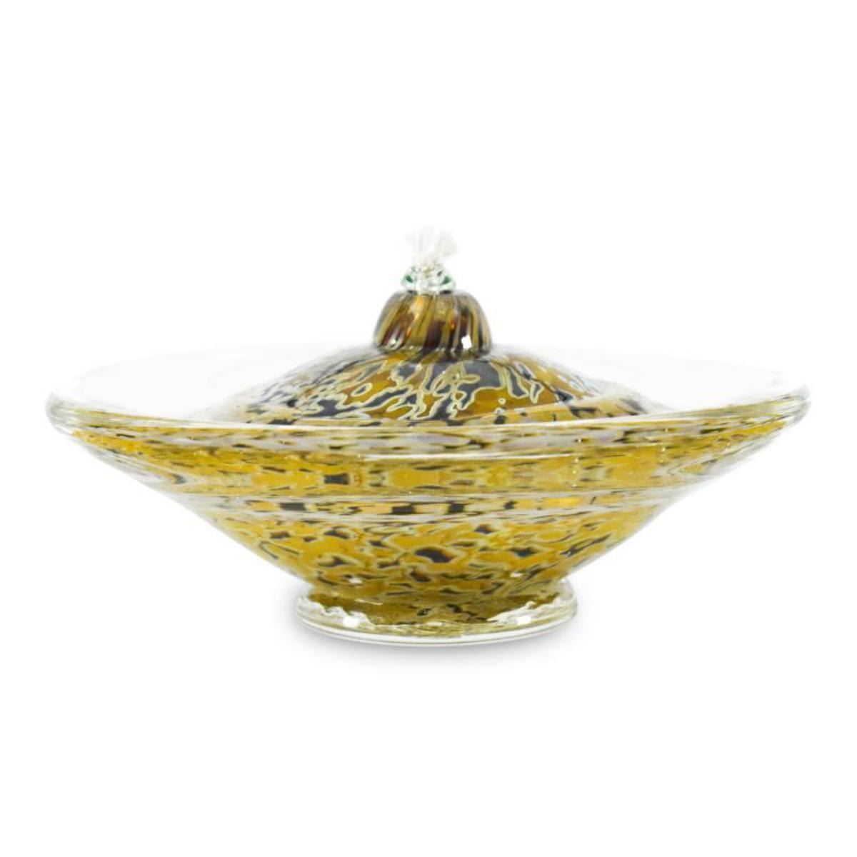 This hand-blown "Small Saturn Oil Light" features a fiberglass wick to get you started, and when lit, the lamp casts a glowing ring of firelight, evoking the rings of majestic Saturn. This one-of-a-kind oil lamp is by GartnerBlade Glass. Measures approx. 5" (diameter) x 3" (height). Reference #: 245431