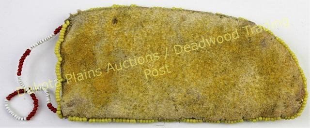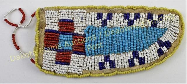 on native tanned leather sinew sewn on main panel in white center reds, blues and whites the perimeter thread sewn in greasy yellow,the beaded white and red loop intact. Fine condition with NO repairs, leather