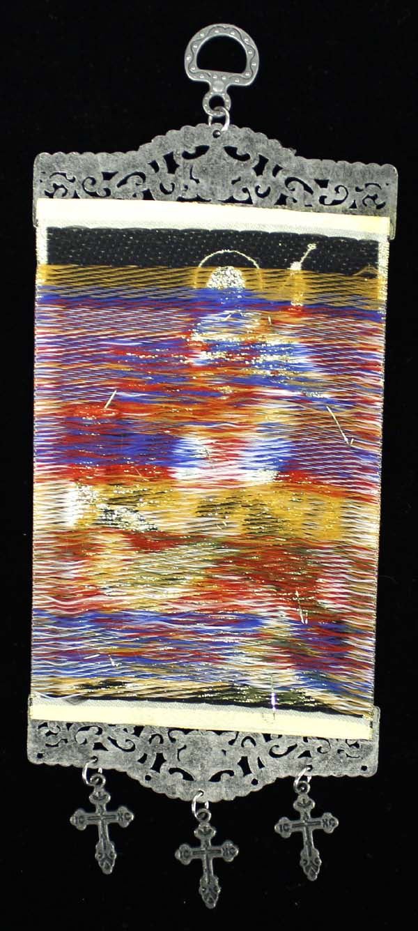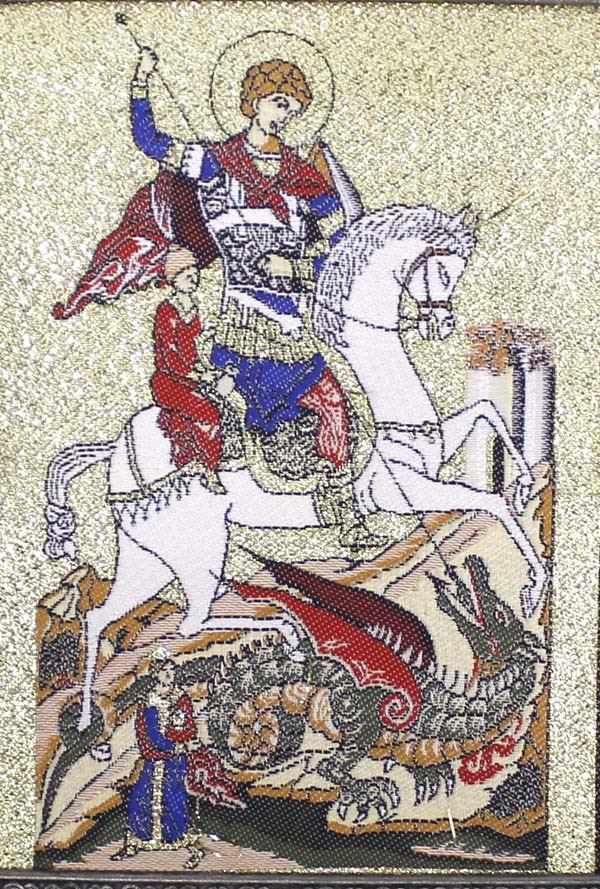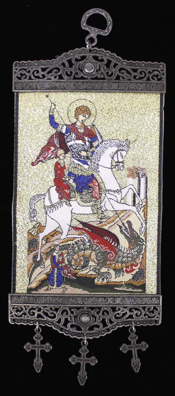 Small Sir George Embroidered Banner Art, ''Slaying of the Dragon'', measures 4'' x 9'', embellished with 3 metal crosses on the bottom