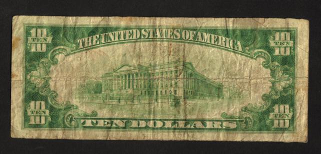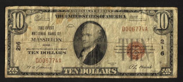 Massillon Ohio $10 National Currency small size note of 1929. Multiple creases but no tears.