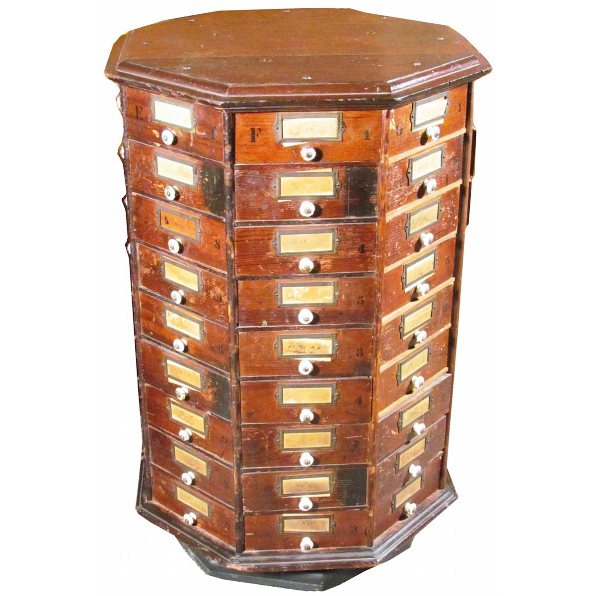 Small Size Hardware Store Bolt Cabinet on revolving base. 8 sided. Very good original condition. 21 inch diameter X 33 inches tall.