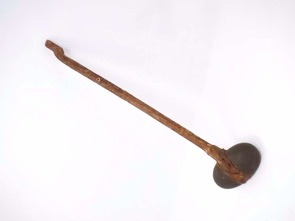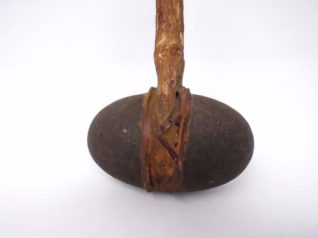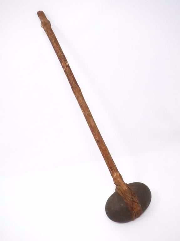 Small stone headed war club of the size known as a "dance" club, used in ceremonies in place of actual combat weapons. About 17.5"