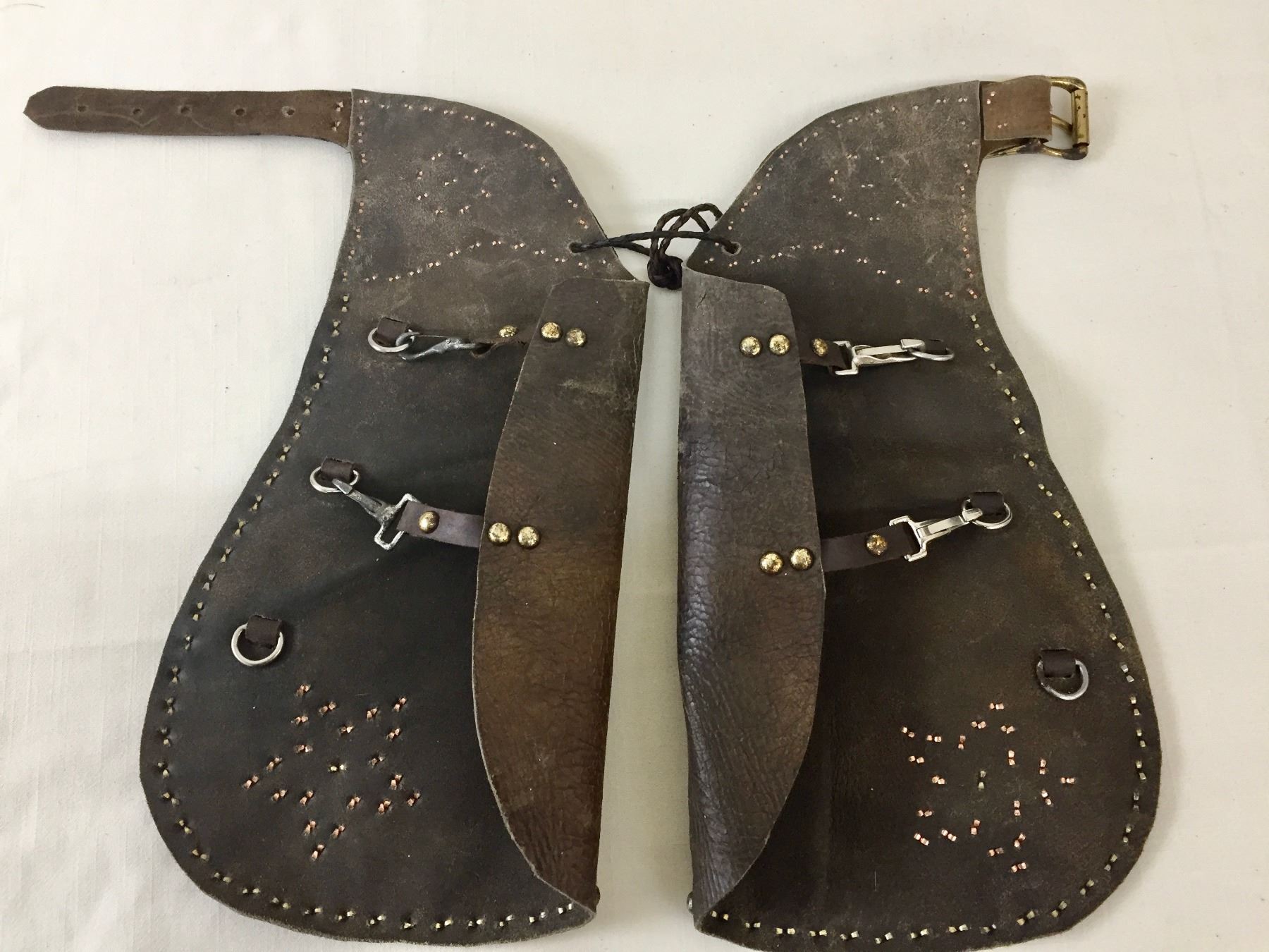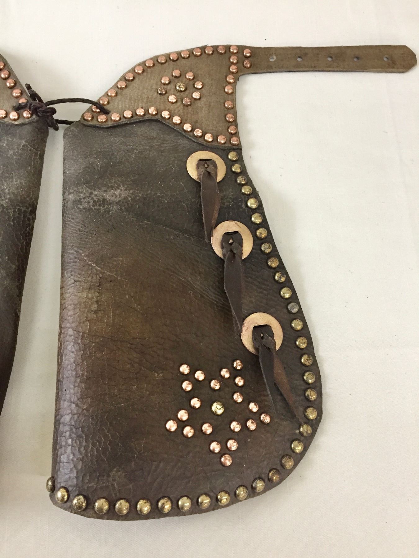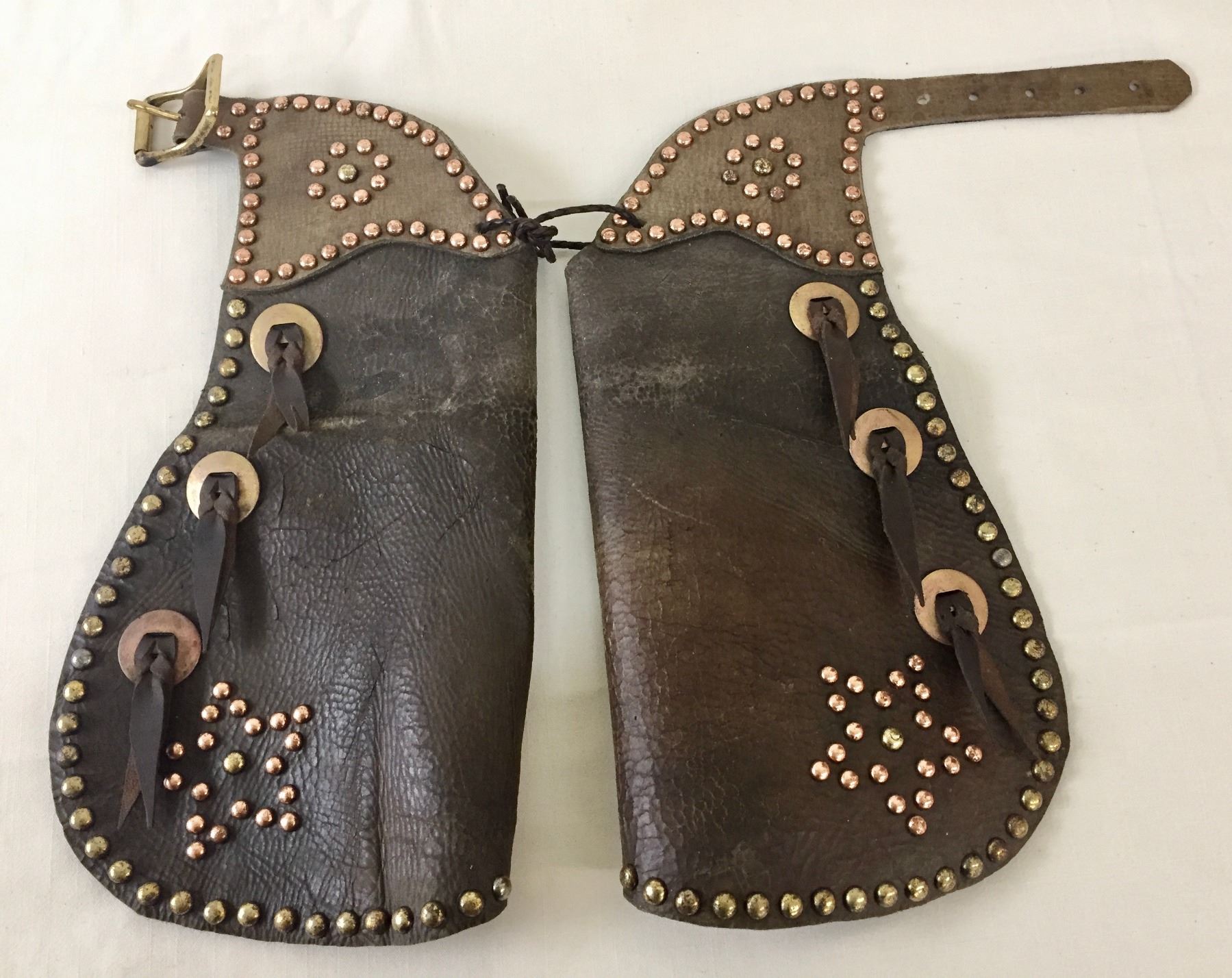 Description: Offered for sale in this lot is a vintage pair of small kids chaps featuring studded designs on the legs, with conchos and leather accents.