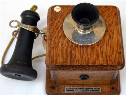 Small telephone wallbox in oak. Measures approx. 5 ½ " x 4" x 7" H. Stromberg- Carlson Mfg. Co., Rochester, New York