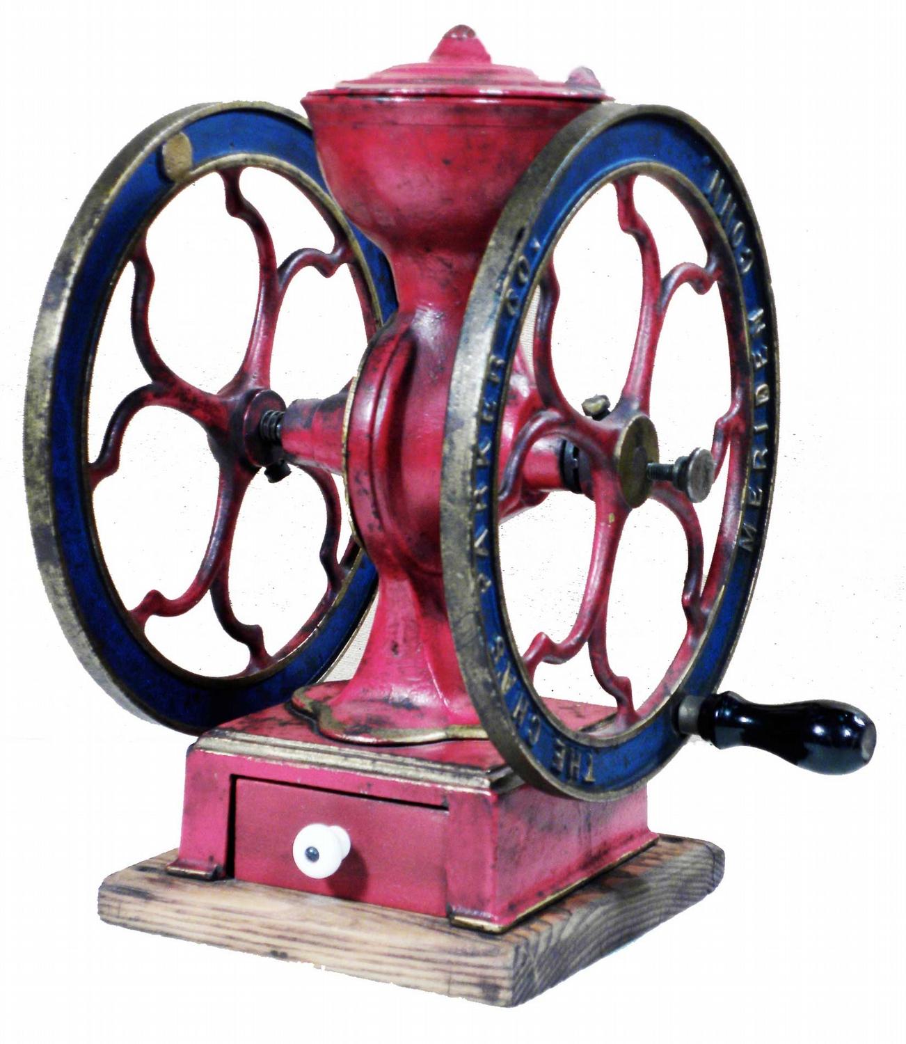 Small The Cha's Parker Co. Coffee Grinder, Meriden, Conn. Very good original condition. 10 inch wheel. 13 1/4 inches tall.
