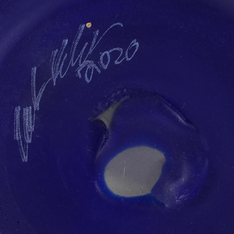 This hand-blown "Small Translucent Strata Urn" combines sand-etched exteriors with an elegant lip accent and is hand signed by GartnerBlade Glass. Measures approx. Measures approx. 4.5" (width) x 10" (height).