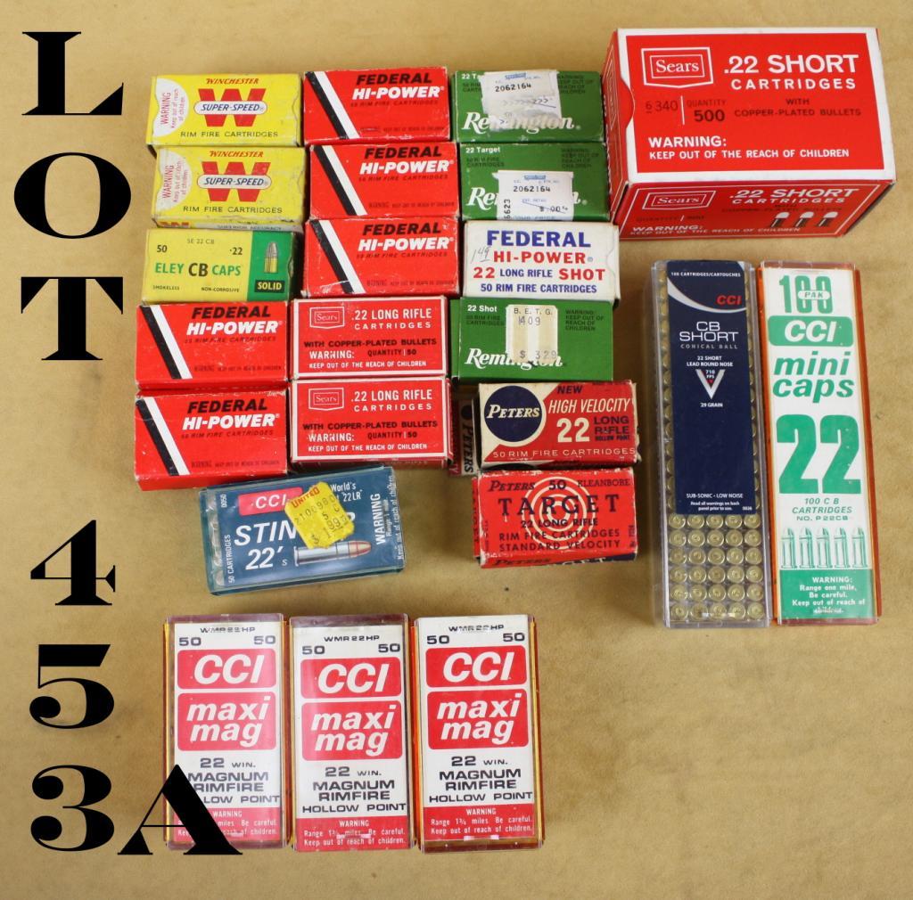 Small U.S. metal ammo can full of .22 caliber collectible ammunition by Winchester, Peters, Remington, CCI, Federal, etc.; some boxes full, some partials, a small bonanza lot. Est.: $50-$75.
