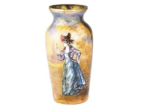 Brass ground colour enamel depicting a landscape and a young lady with hat . Damaged enamel, restored. Circa 1900 Size: 8.5 cm