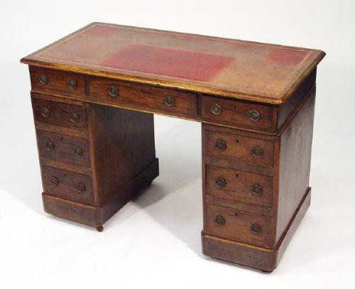 Small Victorian twin pedestal desk with red tooled leather insert, fitted an arrangement of nine drawers, 72cm high, 104cm wide, 55cm deep