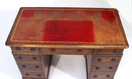 Small Victorian twin pedestal desk with red tooled leather insert, fitted an arrangement of nine dra