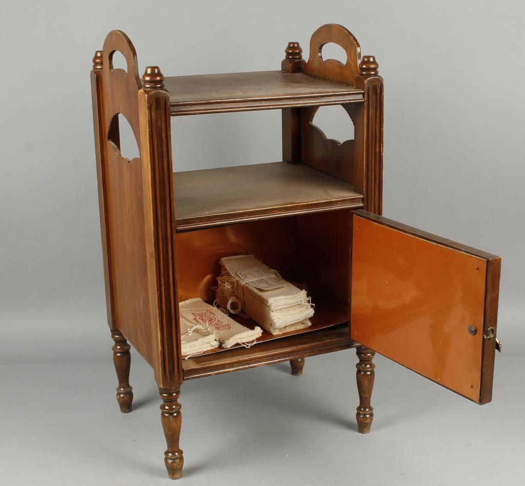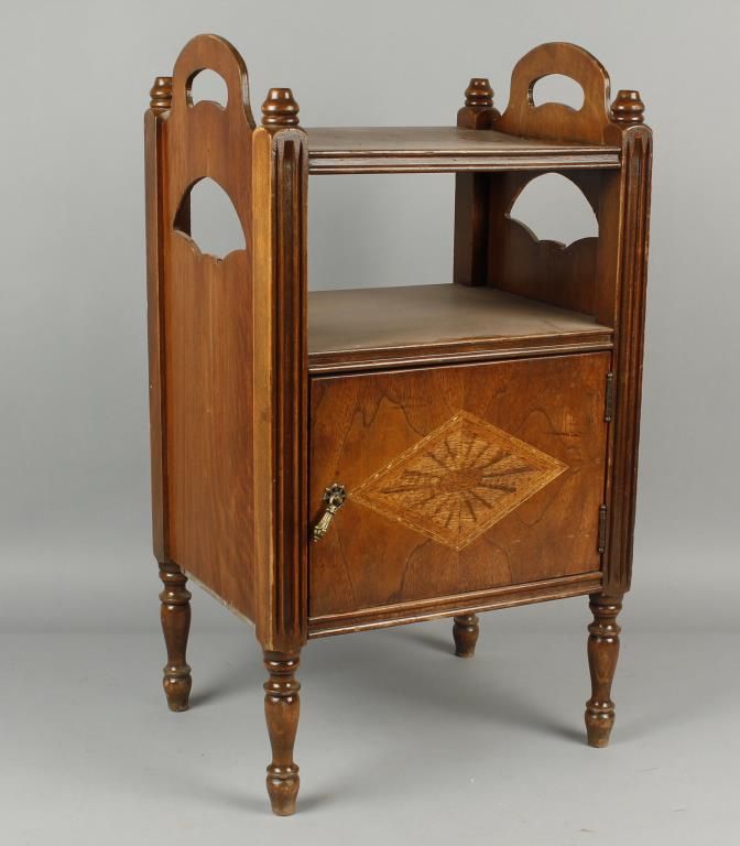 With diamond shaped inlaid hardwood on door, use as a side table and a smoking parlor, measures 25 X 13.5 wide. the condition is overall fair with some bowing of the wood on top, and some age on the legs