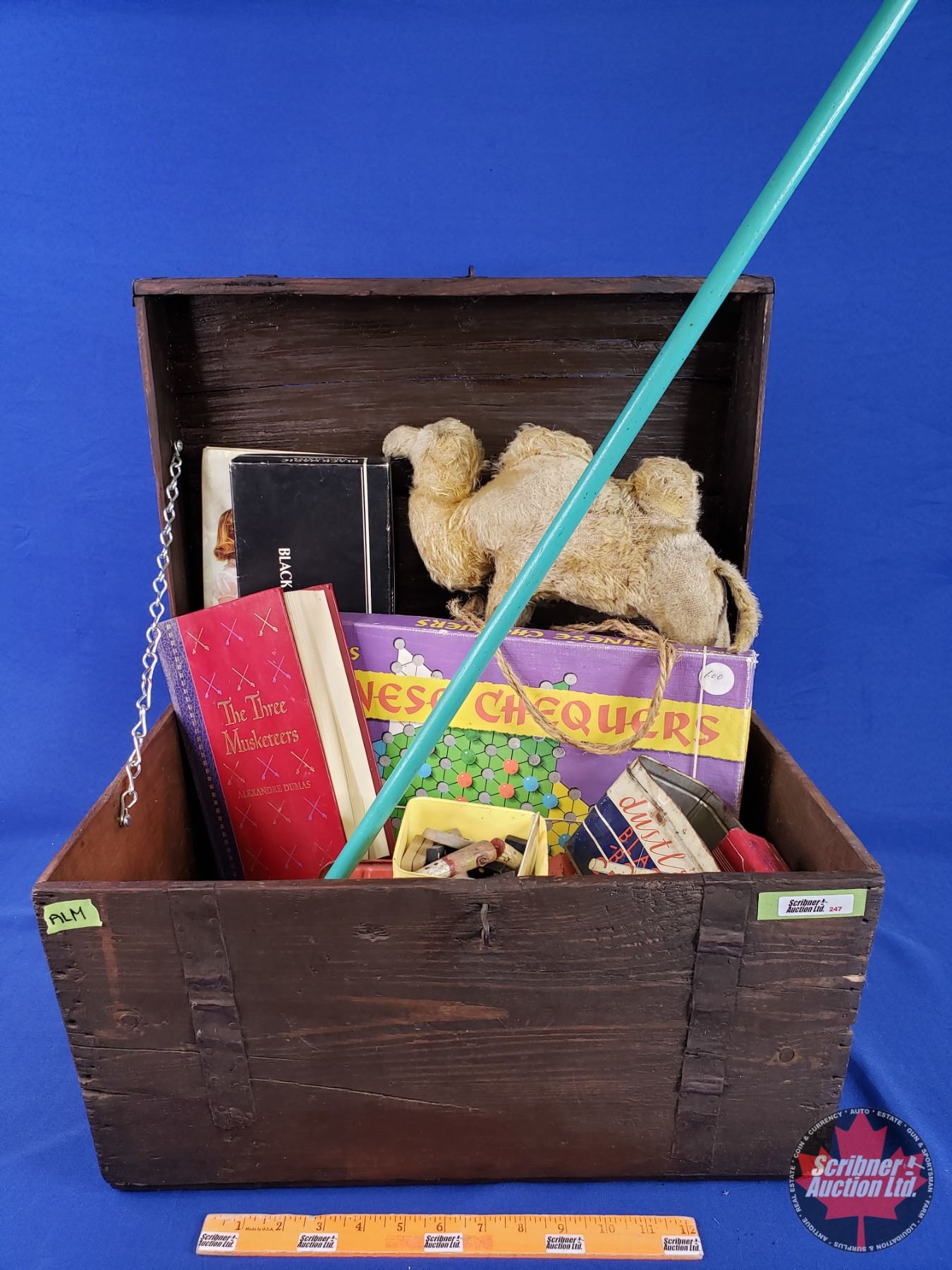 Small Wood Toy Trunk/Chest w/Contents! (Incl. Tonka Truck; Toy Camel; Chinese Checkers; 3 Musketeers Book; etc!) (See Photos for contents) (Trunk Measures: 12-1/2"H x 20"W x 13-1/2"D) (SEE PICS!)
