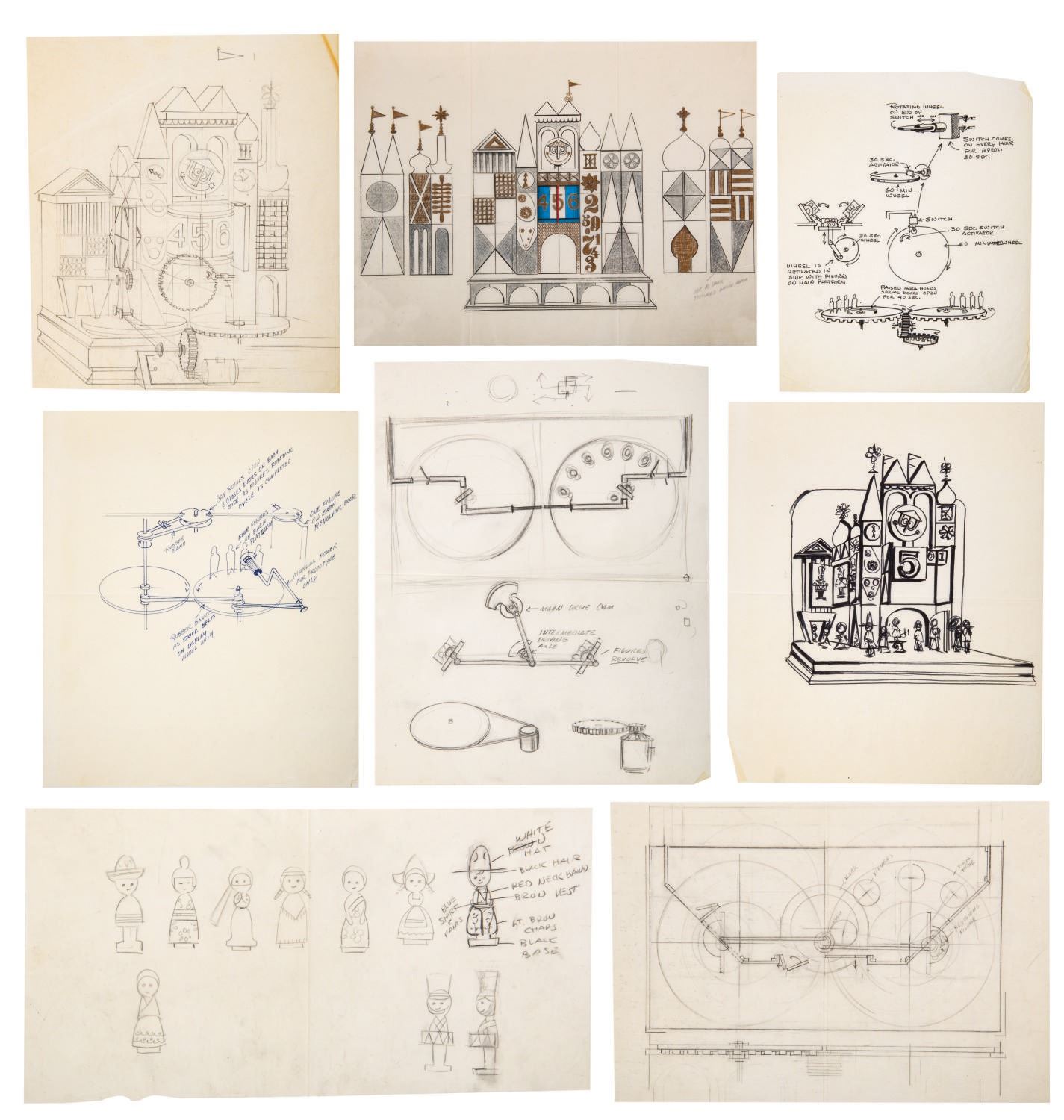 (Disneyland, c.2005) A collection of (14) drawings prepared for a Small World themed souvenir clock. The drawings are accomplished in graphite, pen, and colored pencil on vellum. Ranging from 18"x23.5" to 9.5"x5.25", the artwork is in overall very fine condition.