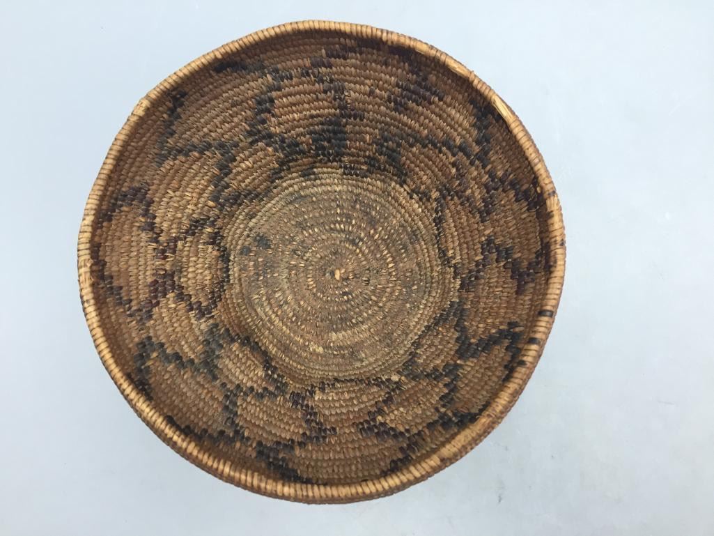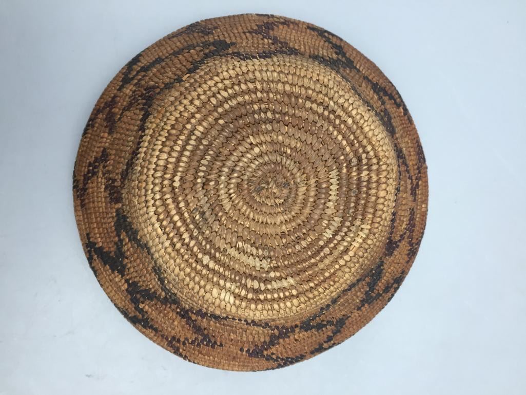 Description: For sale in this lot is a smaller size Yokuts basket. This is a polychrome basket with both red and black design features. Please note that the basket does have some damage along the rim and shows signs of wear. Maker: Unknown Weaver. Approx. Age: Early 1900s. Size: 6 inches wide x 2-3/4 inches tall. Condition: Fair to poor for its age, wear and damage spots expected. Please look closely at the pictures - they are an important part of our description. Shipping: There will be a $8 handling / packaging fee for shipping this lot. The actual cost of postage will be added on top of that.