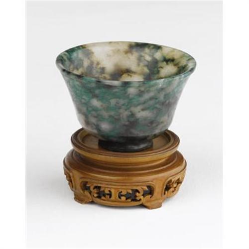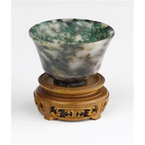 <B>Small Agate Cup without Handles</B></I> <BR>Mottled moss green, brown and gray color; carved wood stand<BR>1-1/4 x 2 inches<BR><BR><b>Shipping:</b> Requires 3rd Party Shipping (<a target="_blank" href="http://www.heritageauctions.com/common/shipping.php">view shipping information</a>)