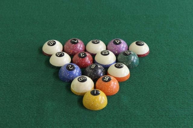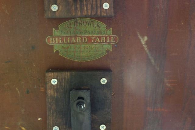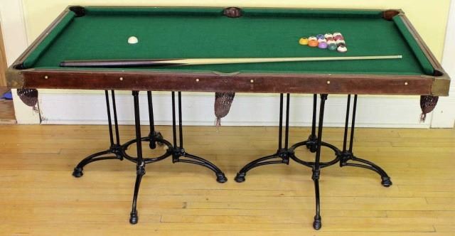 Small antique Burrows pool table72", converted to glass top display table or desk, on contemporary iron decorative legs, beveled glass top is removable, original balls cut in half and included, stands 32" X 42". Est. 500-900