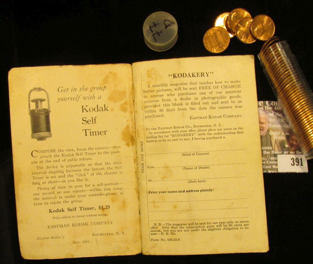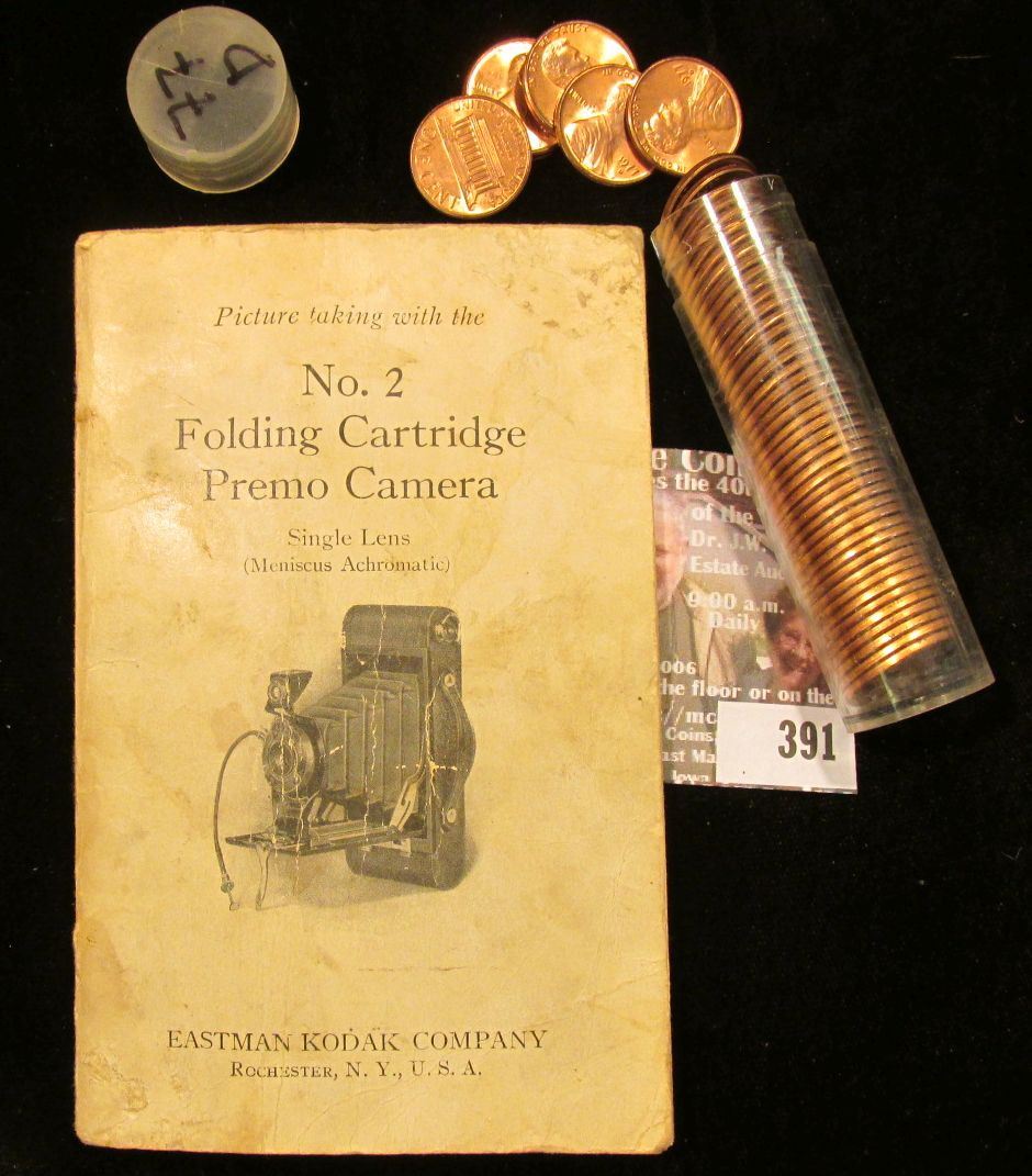 Small booklet "Picture taking with the No. 2 Folding Cartridge Premo Camera Single Lens (Meniscus Achromatic) Eastman Kodak Company Rochester, N.Y., U.S.A.; & 1977 D Gem BU Roll of Lincoln Cents in a plastic tube.