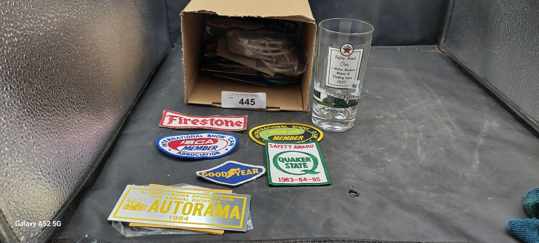 Small box of assorted collectables, pins, patches and car dash plaques etc..